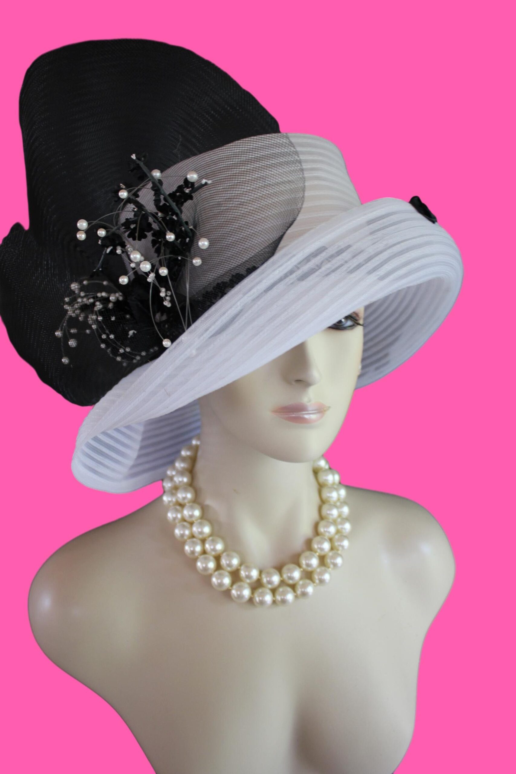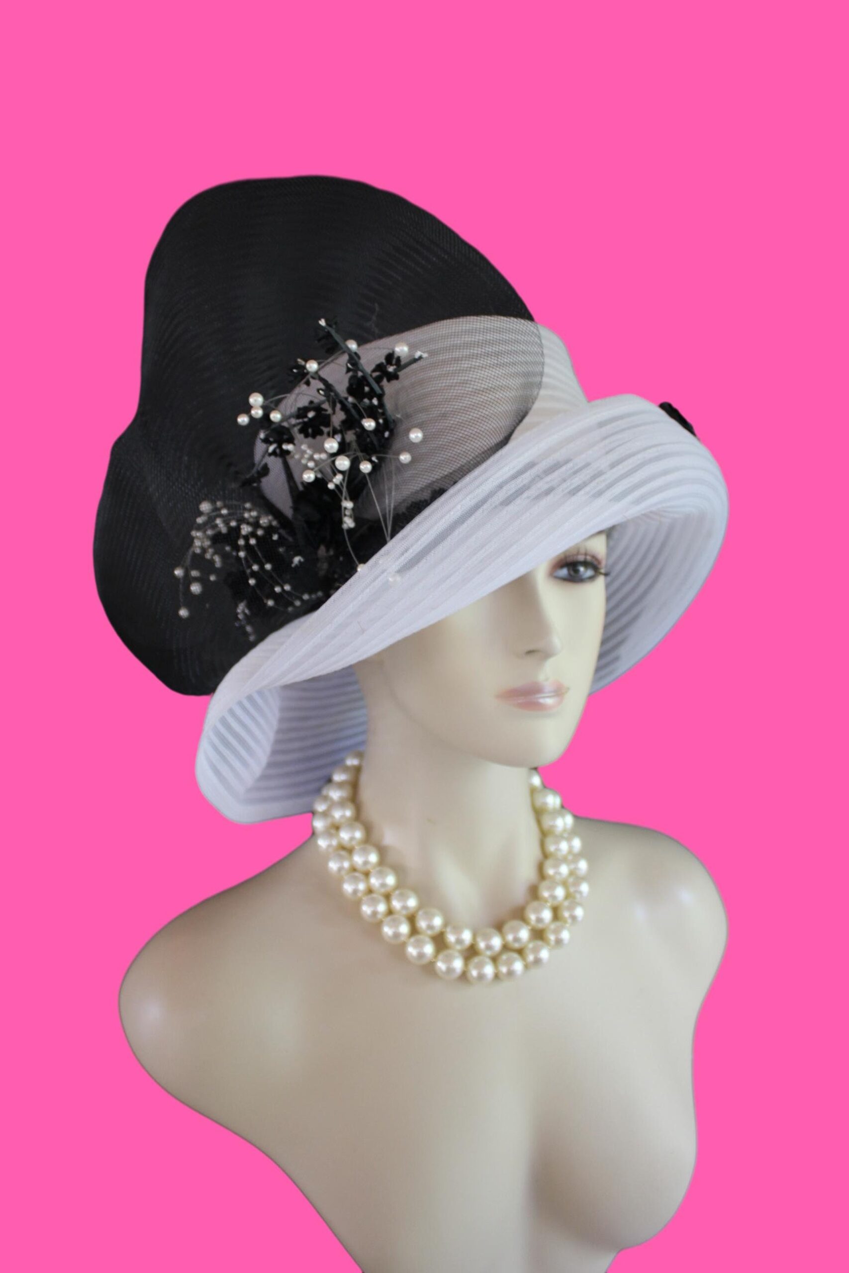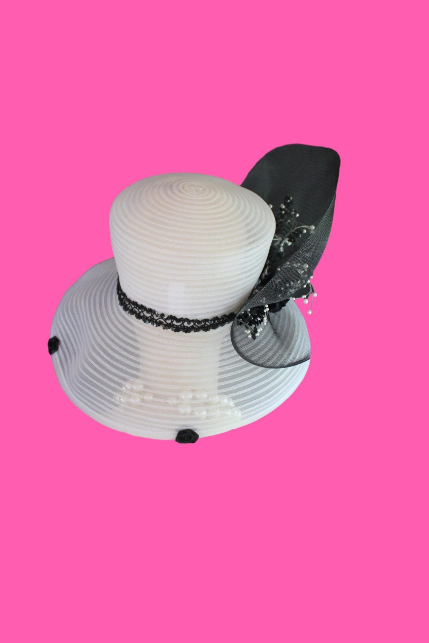 CoutureDesignerHats Millinery For Women,Custom Headdress Apparel For Women,Each Hat Is Custom Made Per Order,Mother Of The Bride Horsehair Polybraid Hat,NYFashion Hats Custom Headwear For Women,Large Horsehair White Bow,Versatile Hat Can Be Worn Different Ways,Sheer Hats For Brides Church Holidays,Suited For Winter Spring Summer Fall,Black White Sheer Big Large Brim Designer Hat,Black Sheer Horsehair Bow,Vintage Black Silk Flowers White Pearls,Brim Can Be Rolled Up Or Worn Lampshade Style