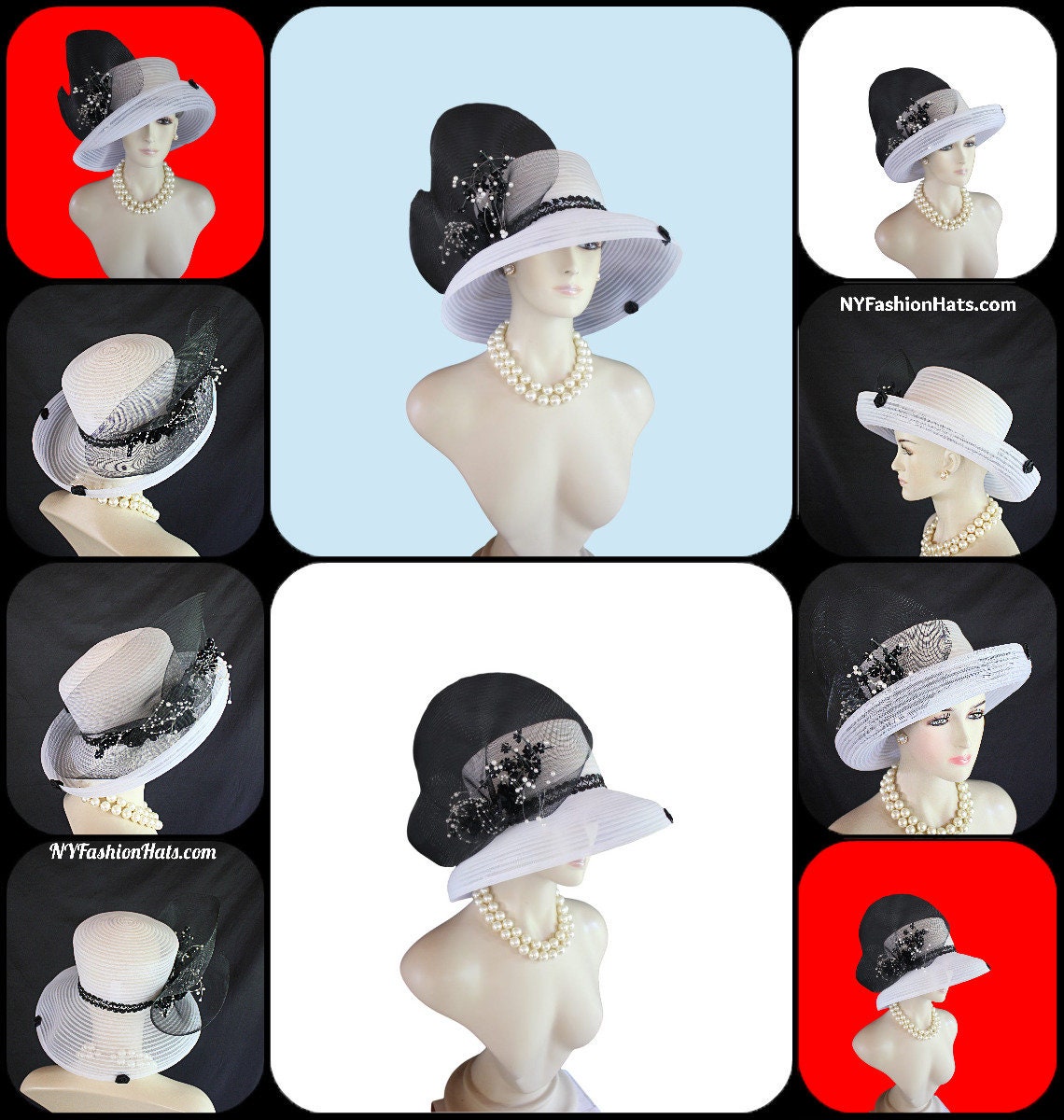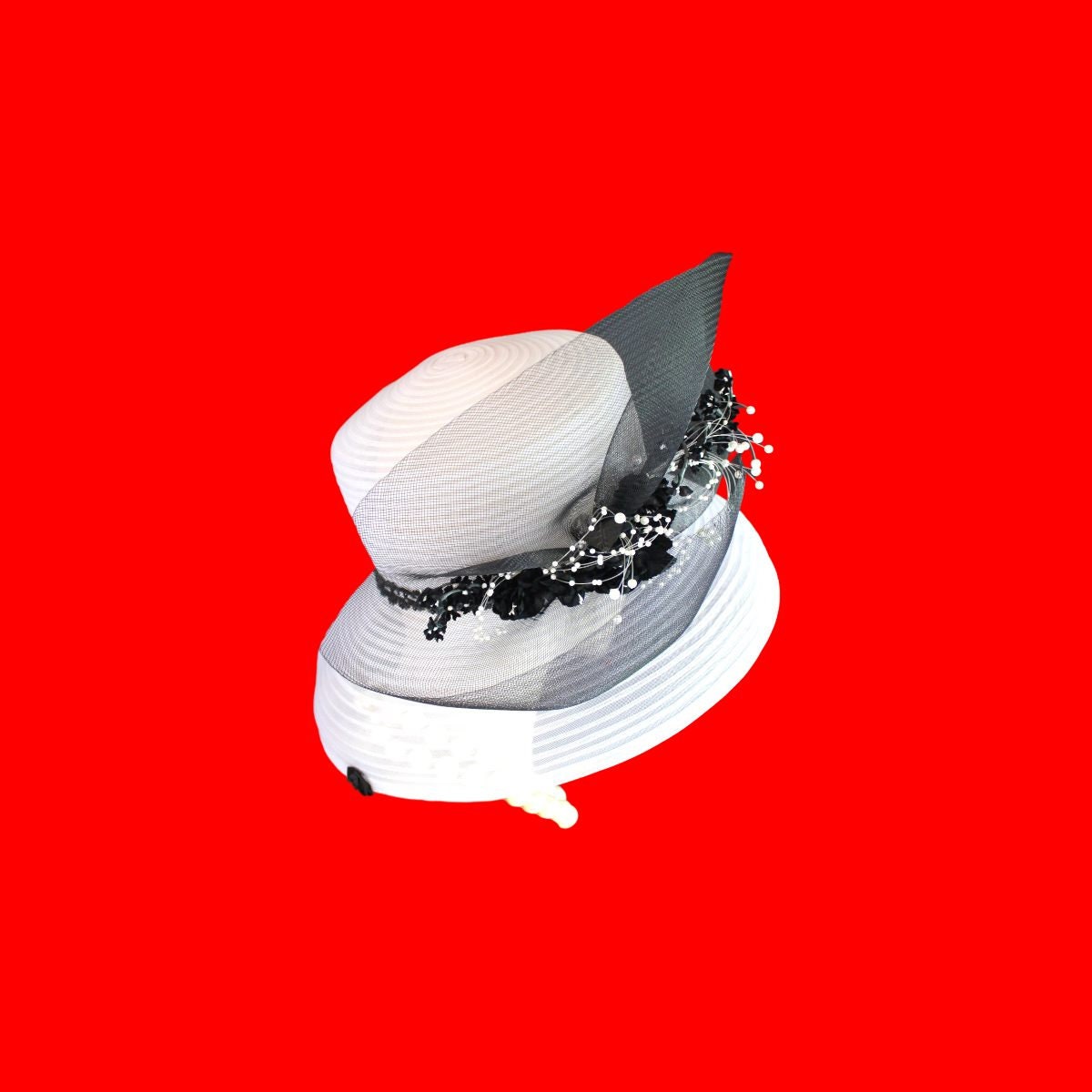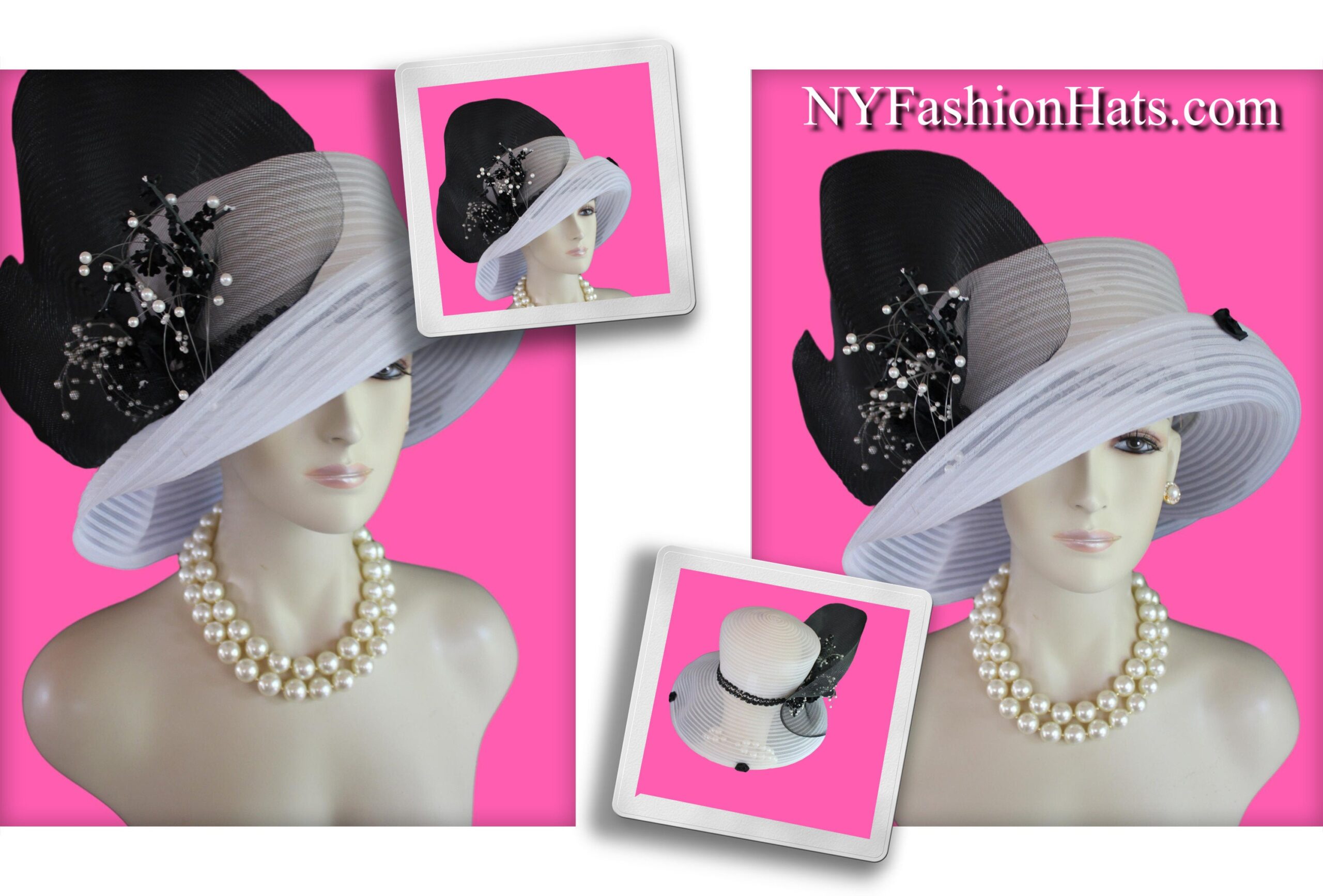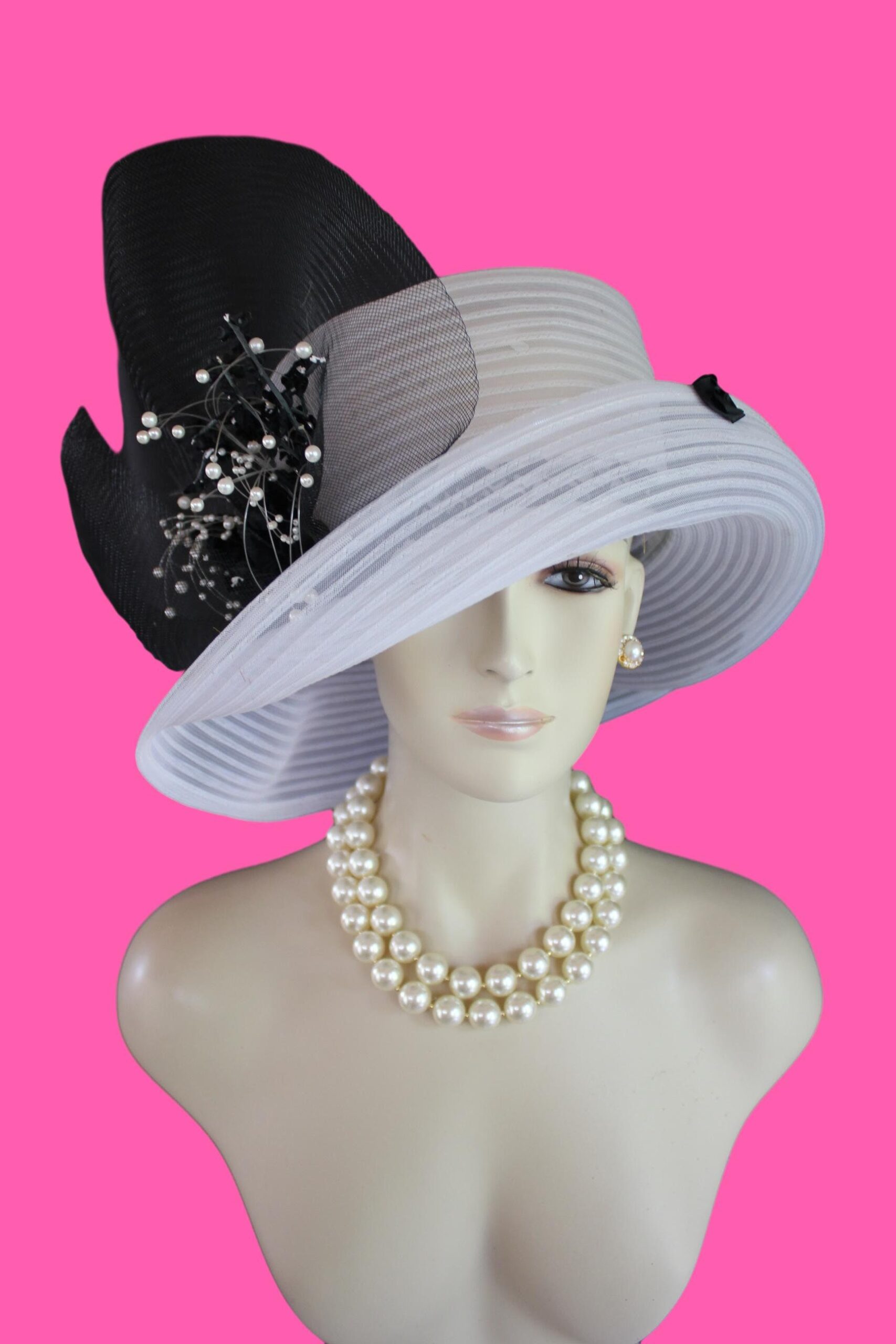 CoutureDesignerHats Millinery For Women,Custom Headdress Apparel For Women,Each Hat Is Custom Made Per Order,Mother Of The Bride Horsehair Polybraid Hat,NYFashion Hats Custom Headwear For Women,Large Horsehair White Bow,Versatile Hat Can Be Worn Different Ways,Sheer Hats For Brides Church Holidays,Suited For Winter Spring Summer Fall,Black White Sheer Big Large Brim Designer Hat,Black Sheer Horsehair Bow,Vintage Black Silk Flowers White Pearls,Brim Can Be Rolled Up Or Worn Lampshade Style