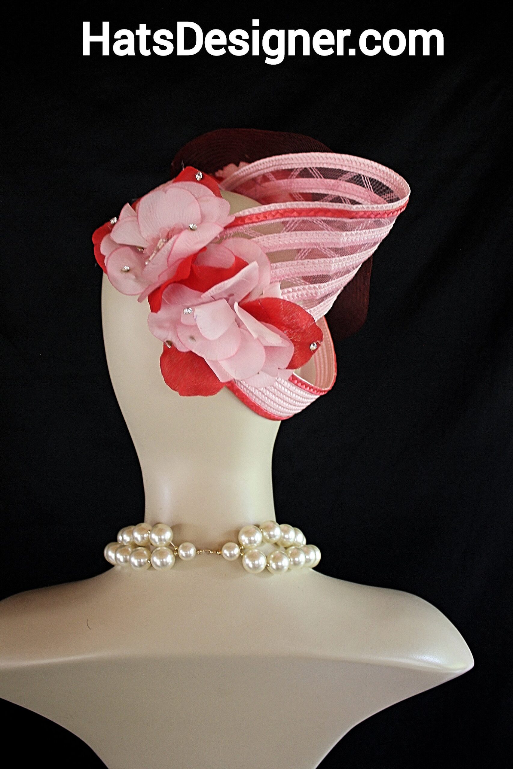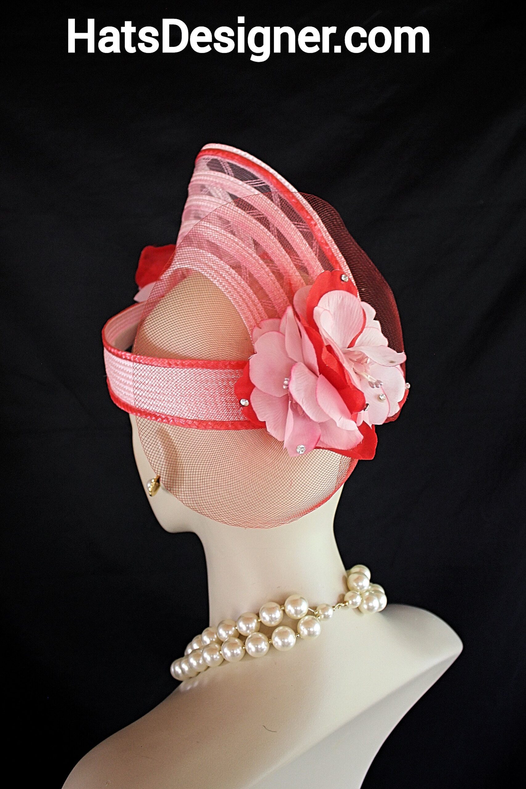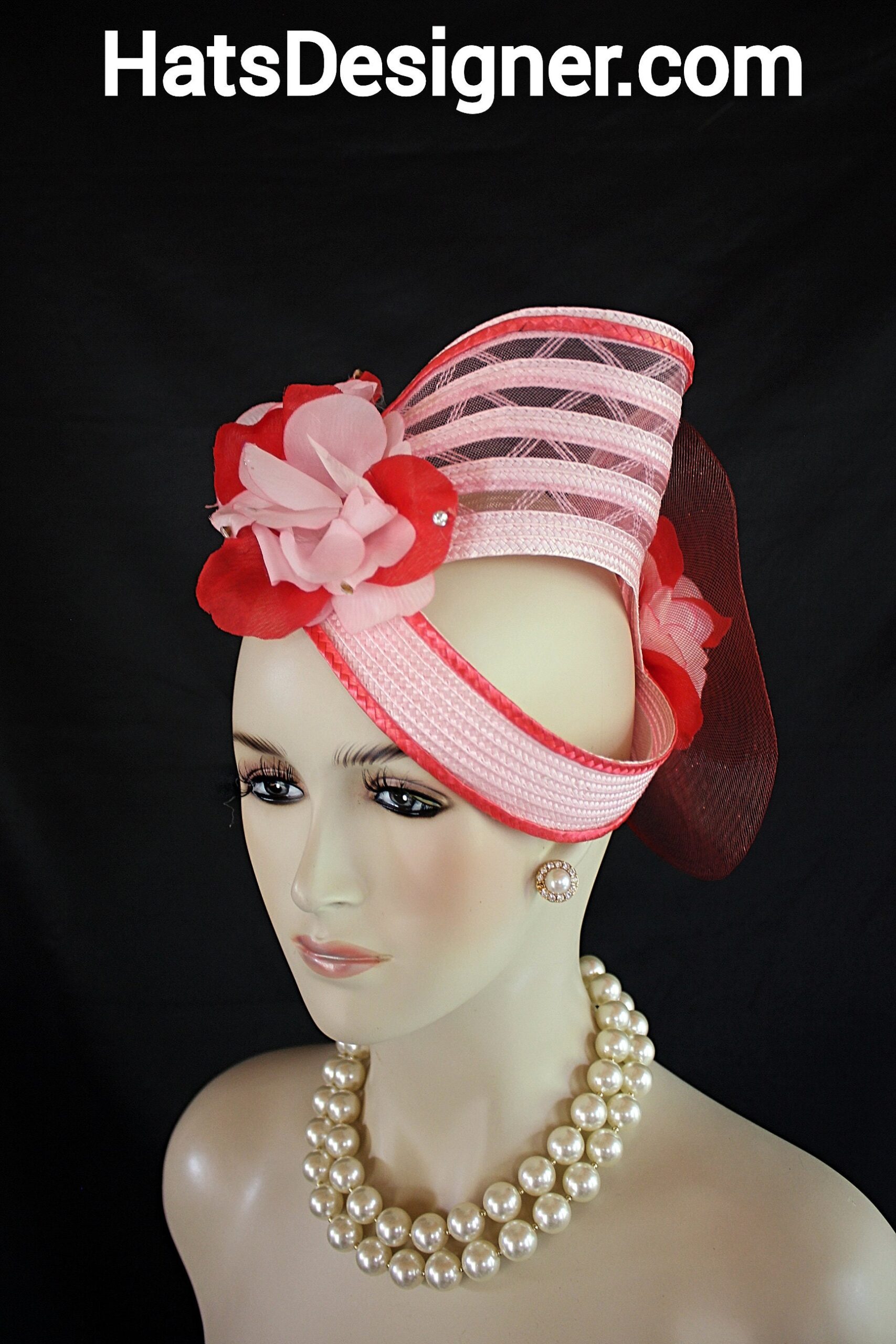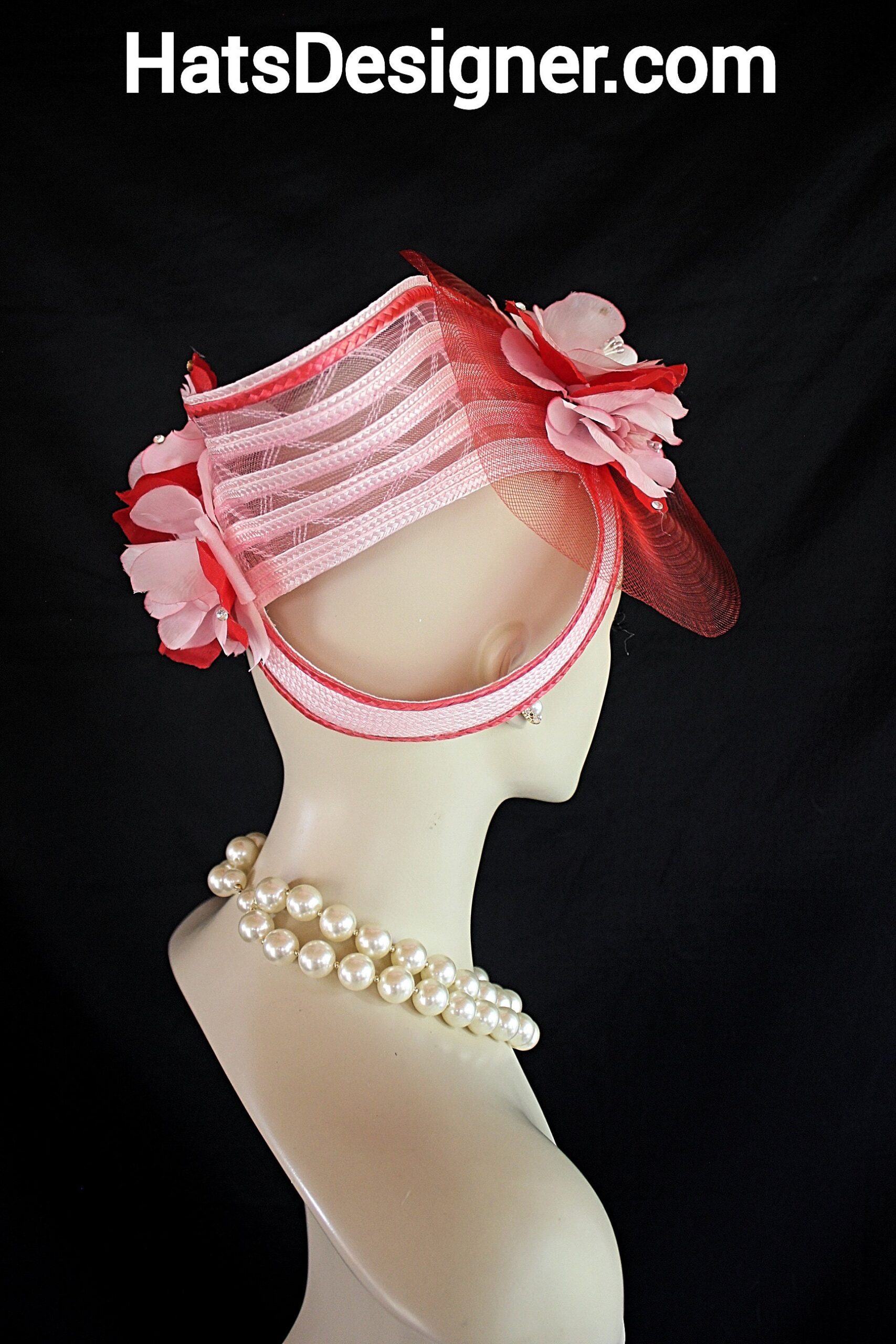 NYFashionHats Headwear Apparel,CoutureDesignerHats Millinery For Women,Custom Headdress Apparel For Women,Each Hat Is Custom Made Per Order,Pink Red Wedding Fascinator Cocktail Hat,Halo Easy Wear Headwear Apparel Millinery,Sculpture Shaped Design Runway,Vintage Pink Red Silk Flowers,Poly Straw Braid Hat Headpiece Fascinator,Swarovski Rhinestones,Vintage Flower Stamens Ornament,Versatile Fascinator Wear In Any Position