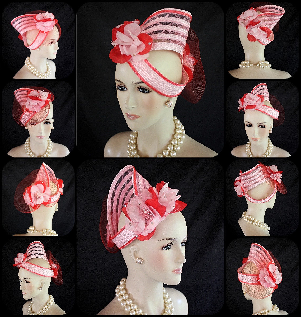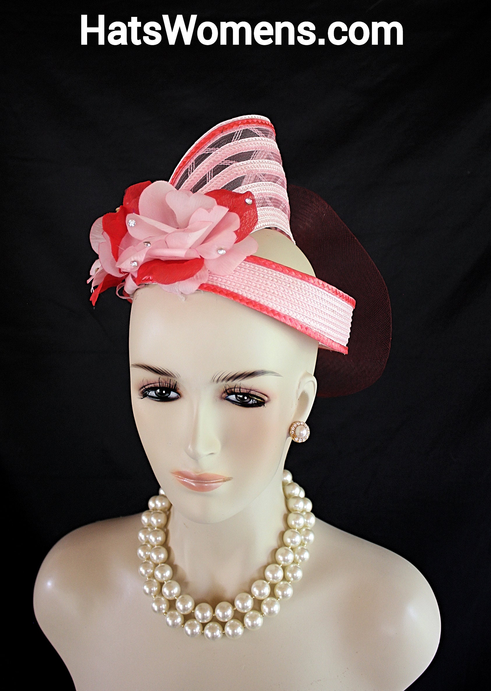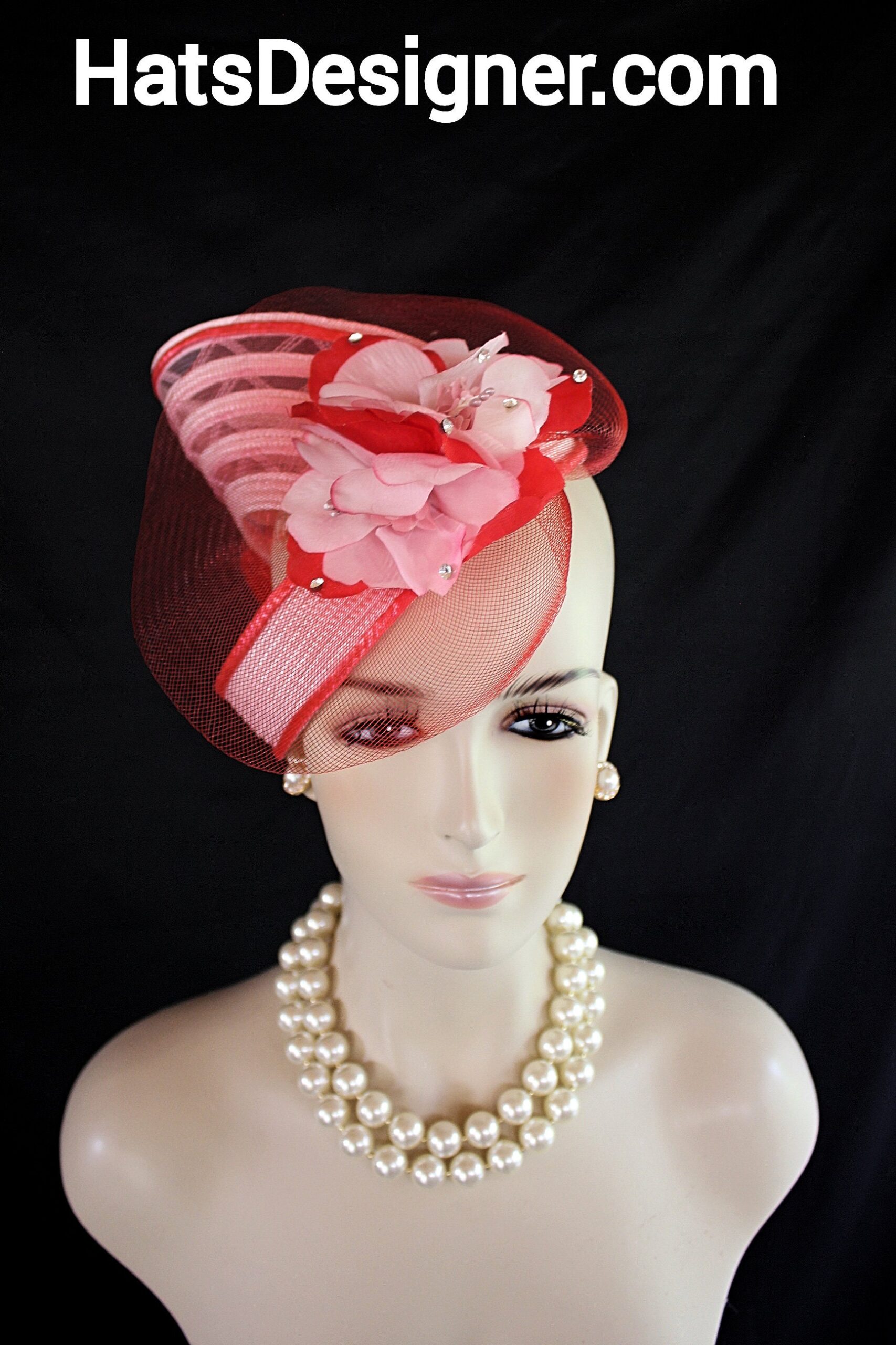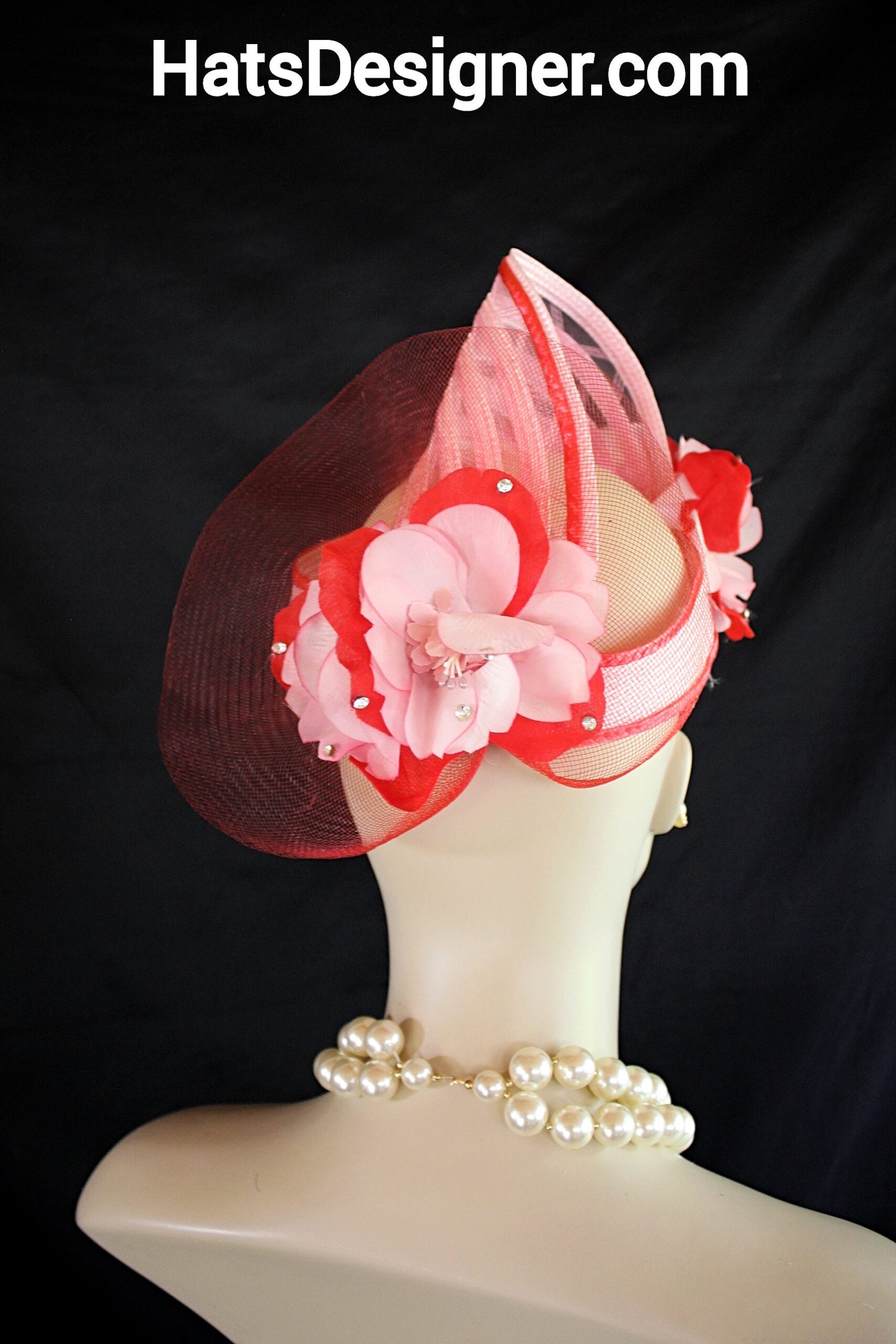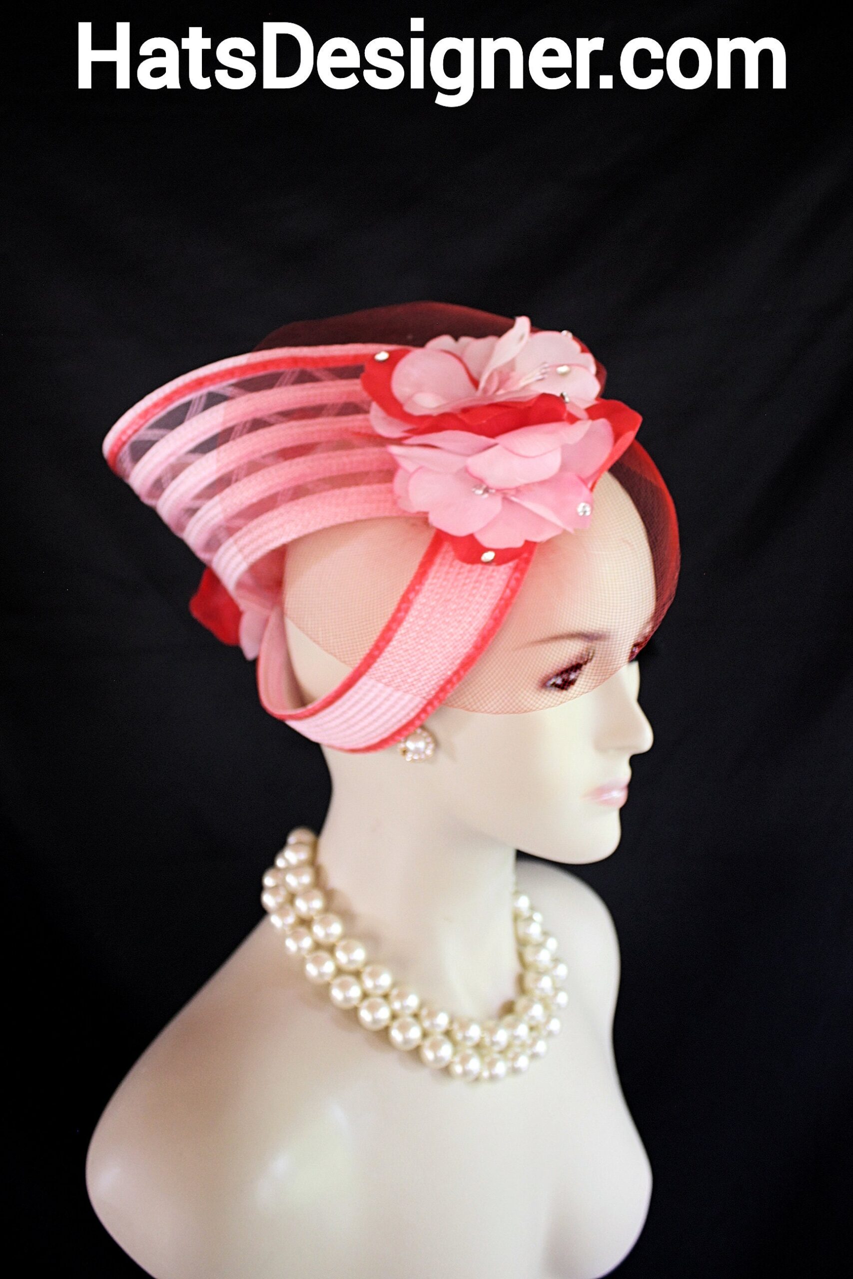 NYFashionHats Headwear Apparel,CoutureDesignerHats Millinery For Women,Custom Headdress Apparel For Women,Each Hat Is Custom Made Per Order,Pink Red Wedding Fascinator Cocktail Hat,Halo Easy Wear Headwear Apparel Millinery,Sculpture Shaped Design Runway,Vintage Pink Red Silk Flowers,Poly Straw Braid Hat Headpiece Fascinator,Swarovski Rhinestones,Vintage Flower Stamens Ornament,Versatile Fascinator Wear In Any Position