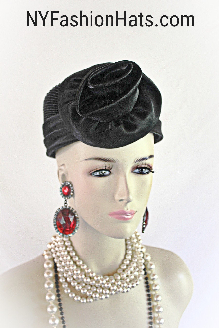 Women’s Black Satin Pleated Couture Formal Pillbox Cocktail Wedding Church Hat. This Classic Styled Dressy Pillbox Holiday Hat Is Embellished With A Satin Rose Bow. This Bridal Mother Of The Bride Headpiece Can Be Worn With Embellishments Toward The Face Or To The Back Of The Head. This Elegant Satin Pillbox Hat Is Custom Made And Designed By NY Fashion Hats Couture Millinery. https://www.nyfashionhats.com. This New Collection Headpiece Is Part Of The Anastasia Konstandina Couture Headdress Line.