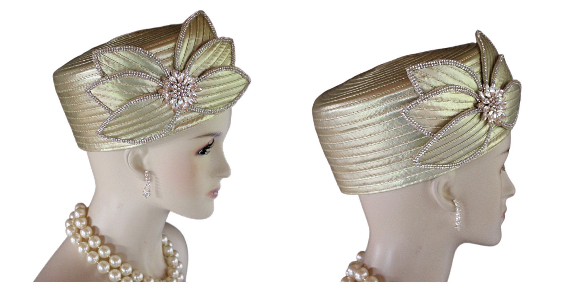 Women’s Metallic Gold Satin Couture Formal Pillbox Cocktail Wedding Church Hat. This Classic Styled Metallic Gold Dressy Pillbox Holiday Hat Is Embellished With A Satin Bow Enhanced With Rhinestones. This Bridal Mother Of The Bride Headpiece Can Be Worn With Embellishments Toward The Face Or To The Back Side Of The Head. This Elegant Satin Pillbox Hat Is Custom Made And Designed By NY Fashion Hats Couture Millinery. https://www.nyfashionhats.com. This New Collection Headpiece Is Part Of The Anastasia Konstandina Couture Headdress Line.