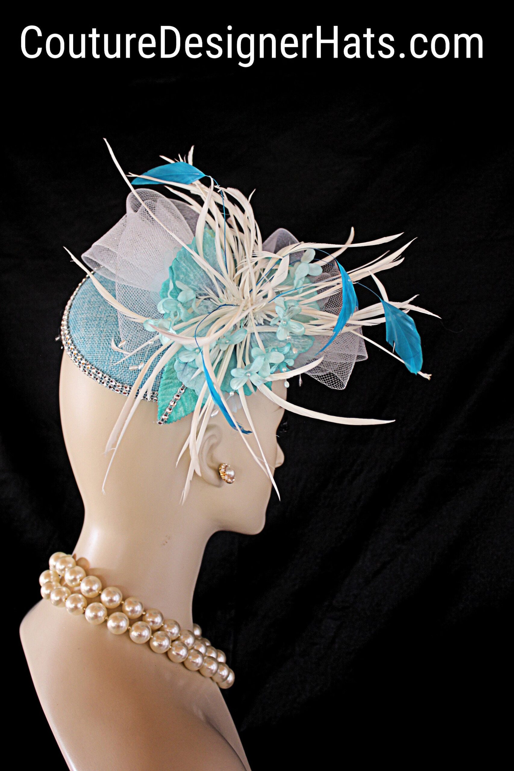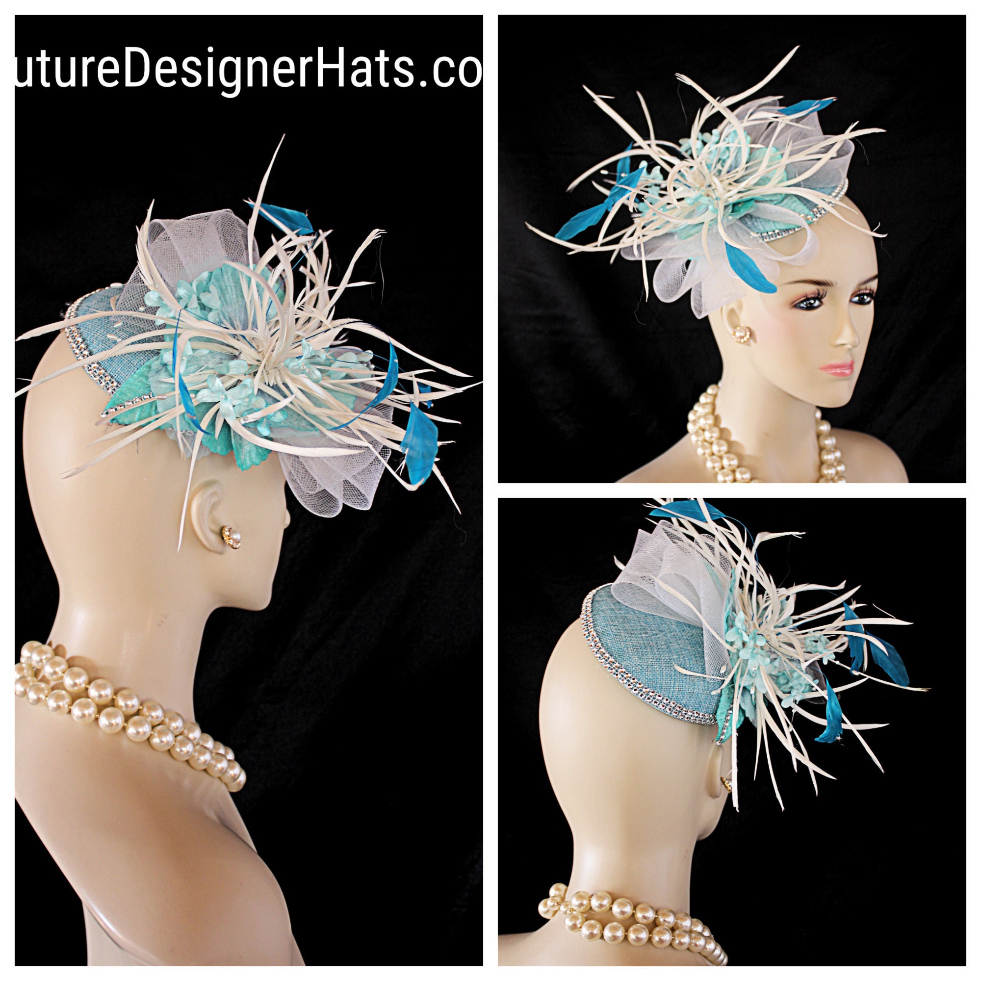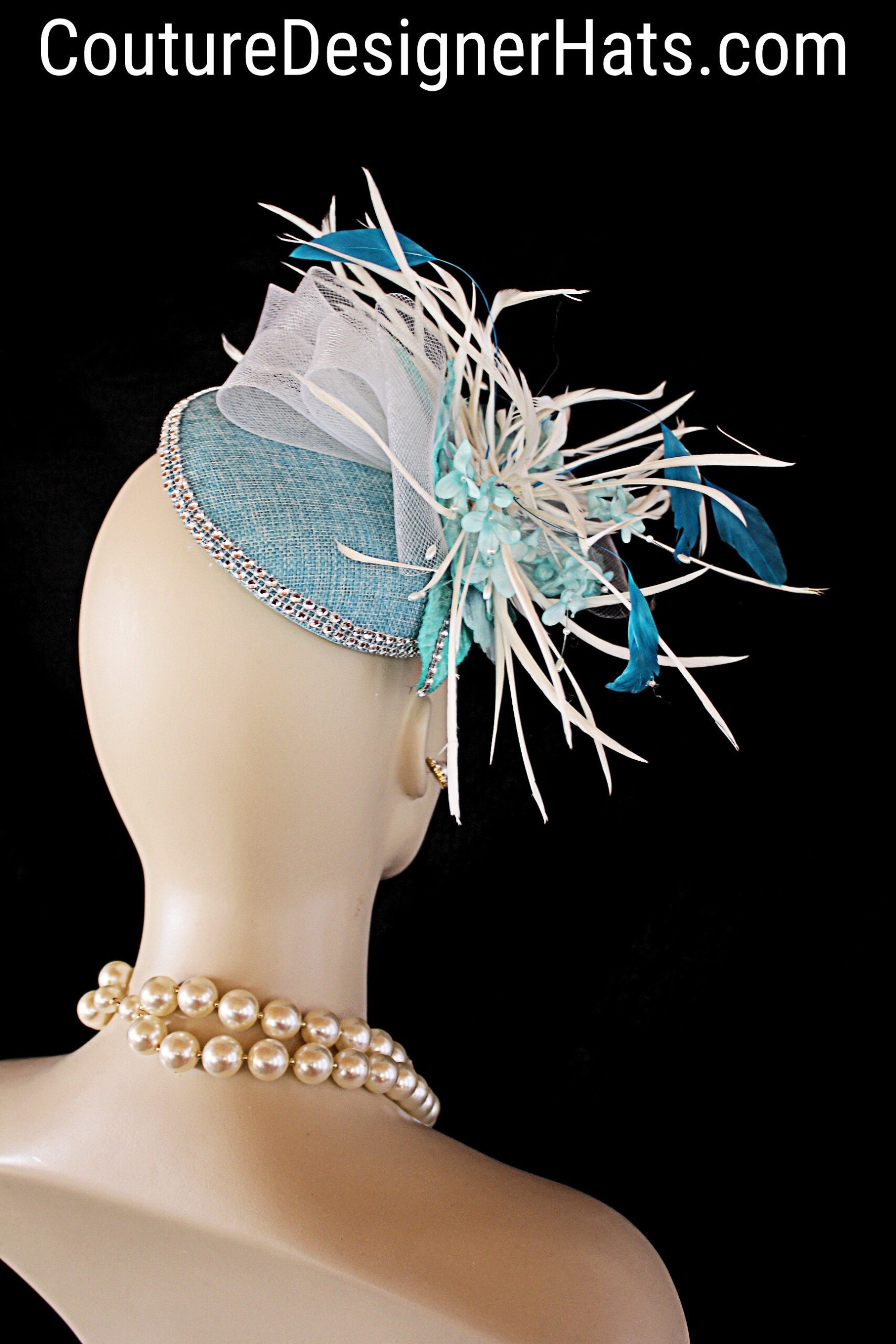 Alligator Hair Clip Holds Fascinator In Place,Handmade Couture Fascinator,Couture Designer Hat Fascinator,New Fascinator Custom Made,NYFashionHats,Couture Designer Hats,Each Fascinator Is Made Per Order,Poly Sinamay Straw Disk Saucer Hat Base,Baby Blue Aqua Turquoise Wedding Fascinator,Poly Sinamay Straw Baby Blue Hat Base,White Goose Biot Feathers,Turquoise Blue Coque Feathers,White Horsehair Bow Silk Vintage Flowers