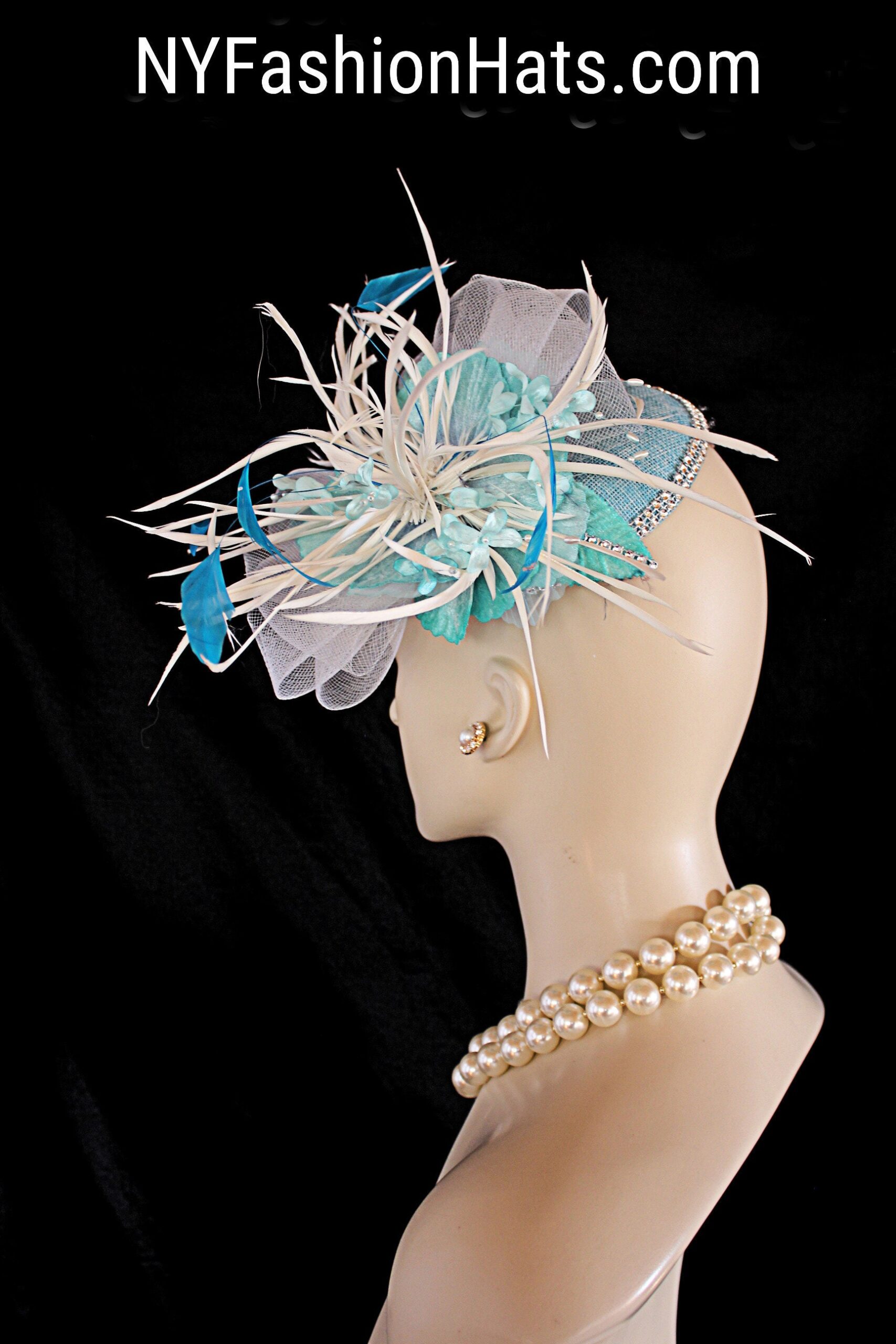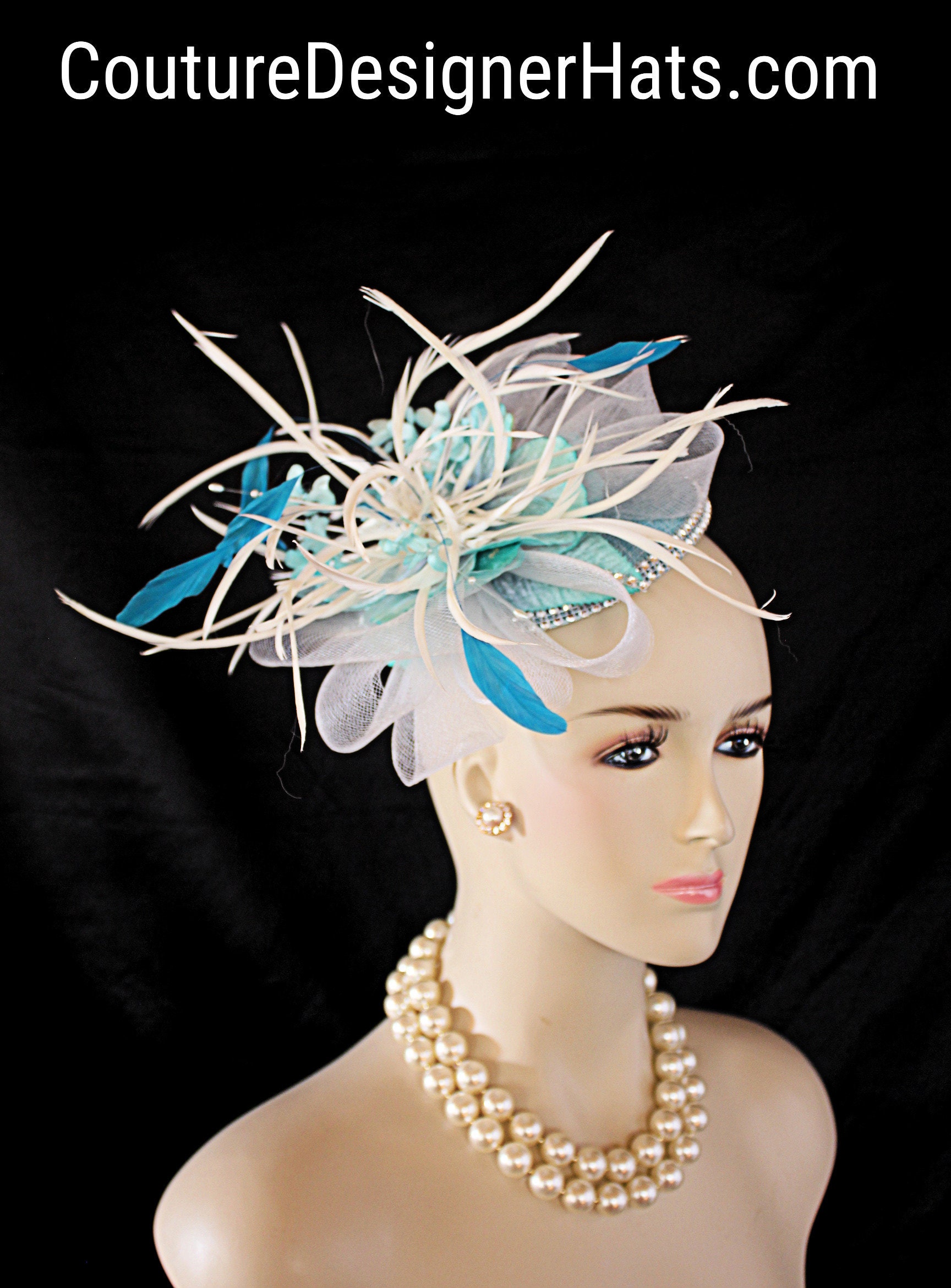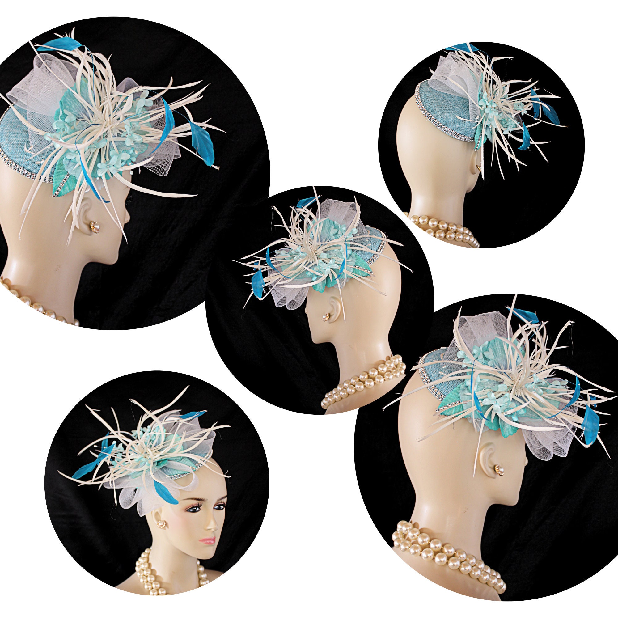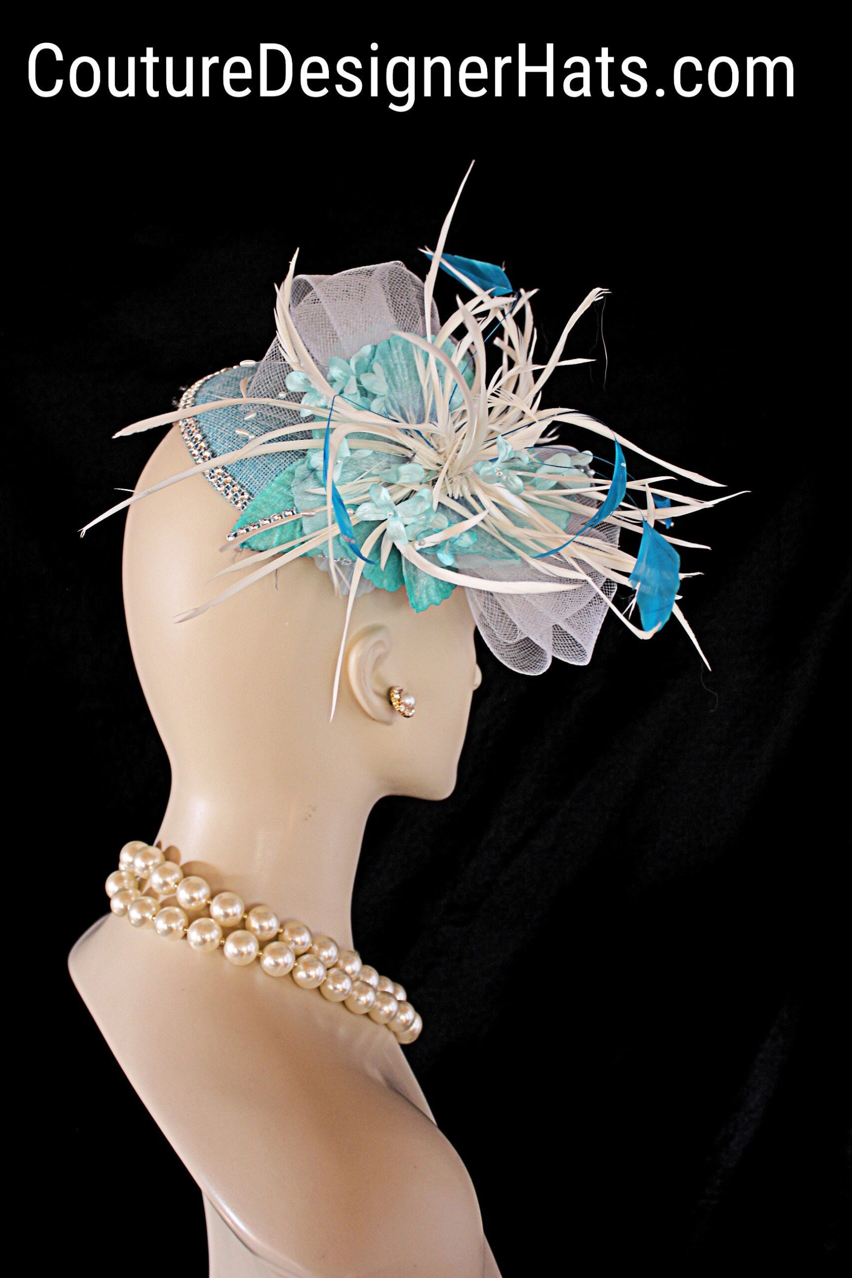 Alligator Hair Clip Holds Fascinator In Place,Handmade Couture Fascinator,Couture Designer Hat Fascinator,New Fascinator Custom Made,NYFashionHats,Couture Designer Hats,Each Fascinator Is Made Per Order,Poly Sinamay Straw Disk Saucer Hat Base,Baby Blue Aqua Turquoise Wedding Fascinator,Poly Sinamay Straw Baby Blue Hat Base,White Goose Biot Feathers,Turquoise Blue Coque Feathers,White Horsehair Bow Silk Vintage Flowers