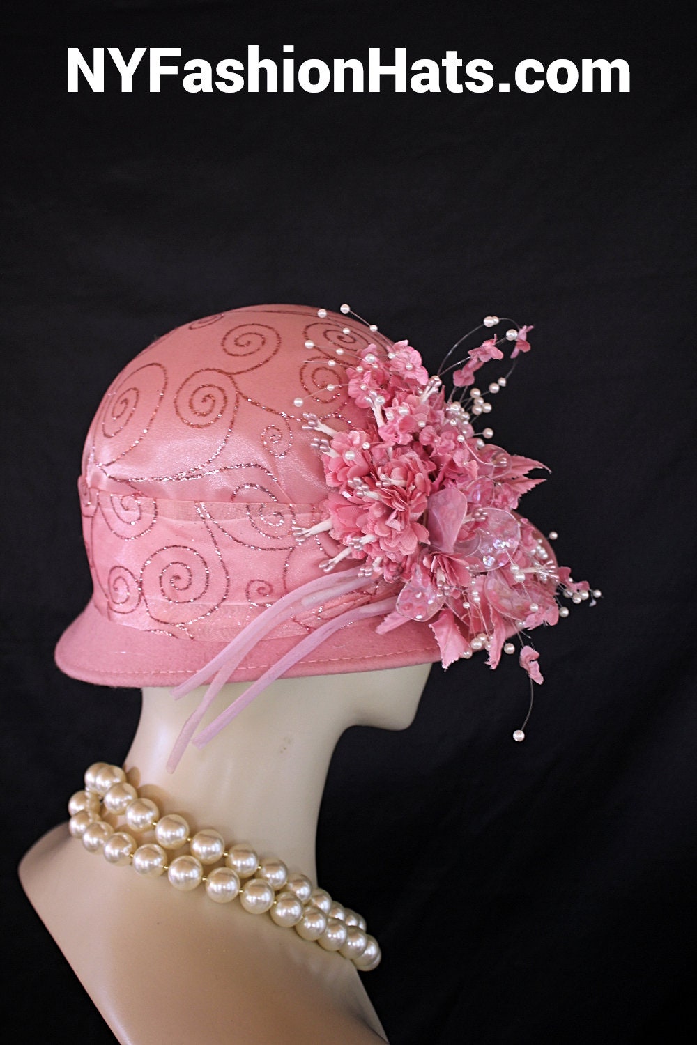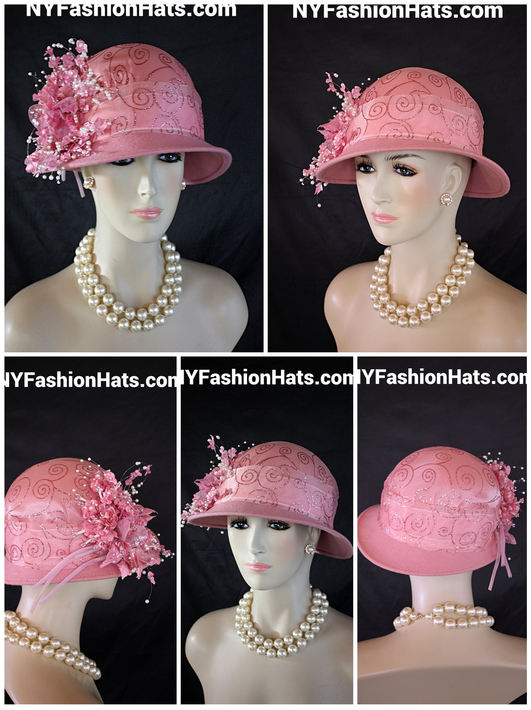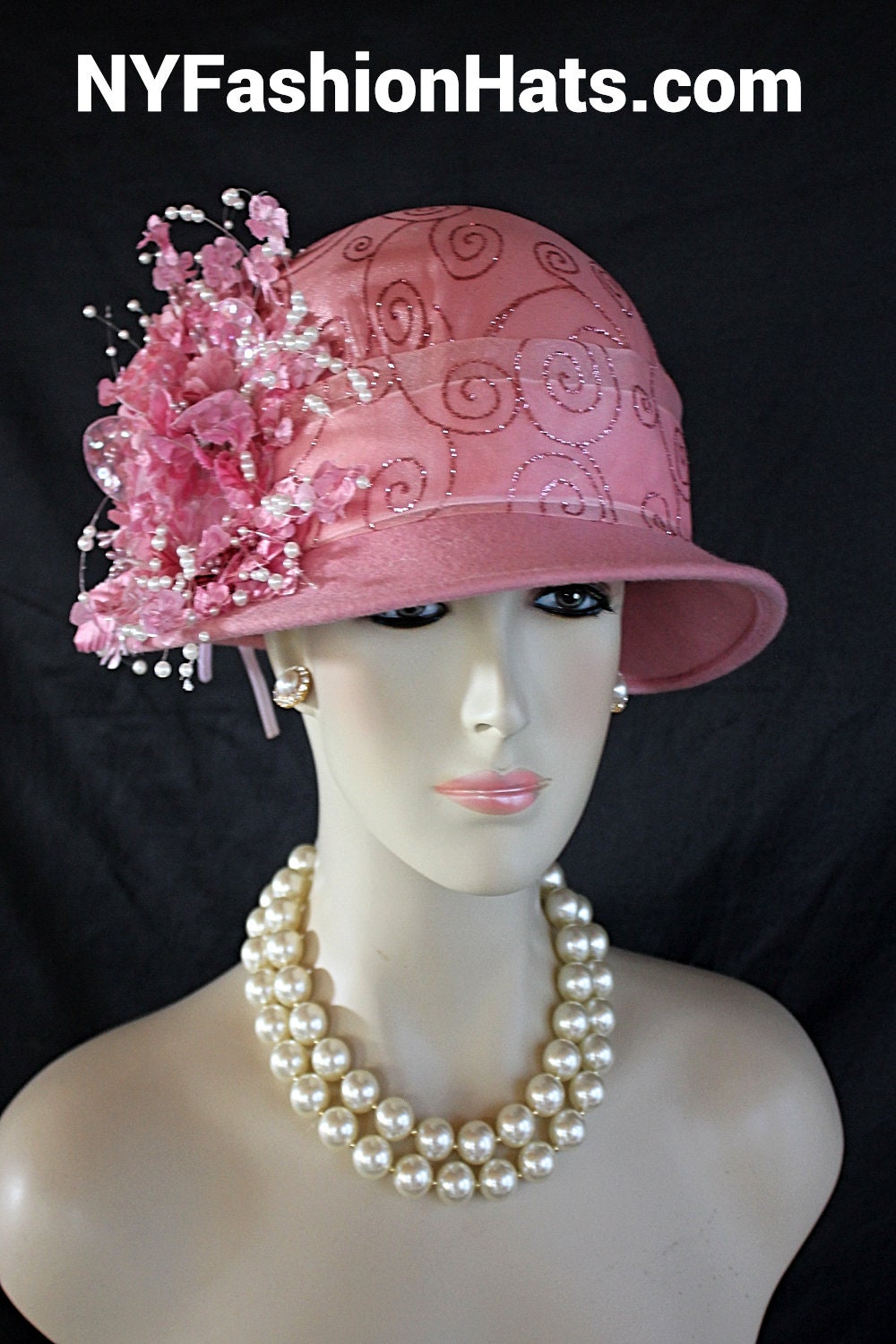 Womens Dusty Pink Cloche Luxury Designer Hat,NYFashionHats Haute Couture Hats Millinery,Pink Organza Sheer Pink Glitter Fabric,Vintage Pink Silk Flowers,Shooting White Pearls,Organza Sequin Handmade Flower Petals,Handmade Flower Stems Vintage,A symmetrical Small Shaped Brim,One Of A Kind Fashion Hat,Mother Of The Bride Bridal Hat,Custom Formal Church Wedding Hat,Pink Stamens Vintage,Cloche Styled Fashion Hat