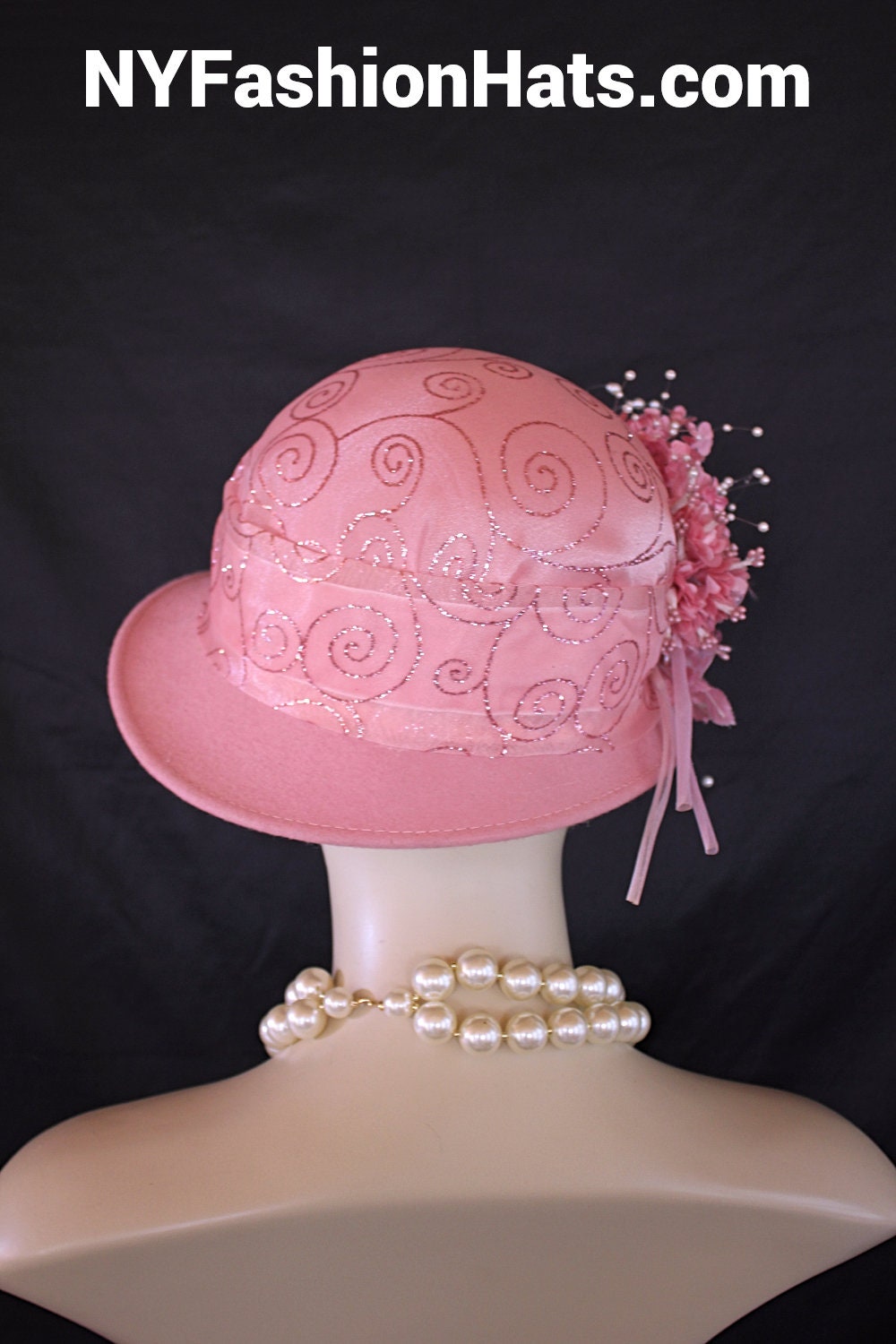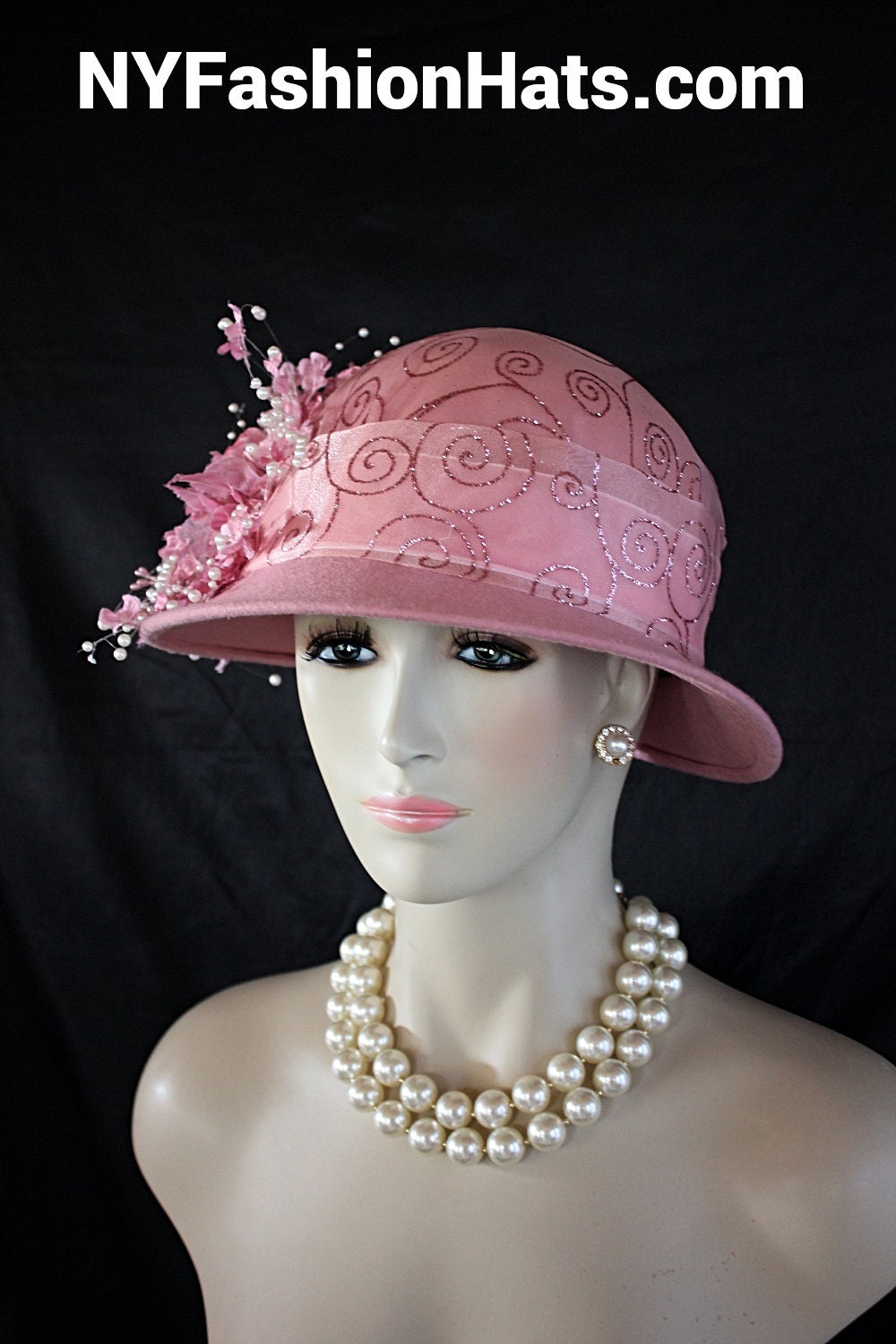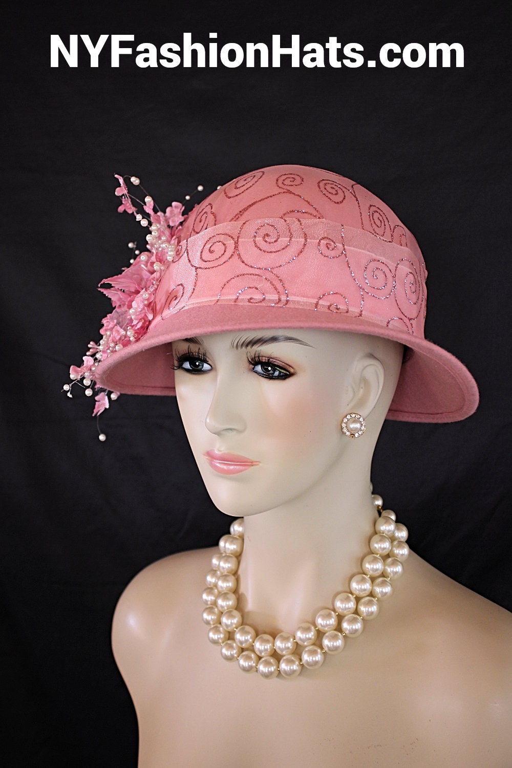 Womens Dusty Pink Cloche Luxury Designer Hat,NYFashionHats Haute Couture Hats Millinery,Pink Organza Sheer Pink Glitter Fabric,Vintage Pink Silk Flowers,Shooting White Pearls,Organza Sequin Handmade Flower Petals,Handmade Flower Stems Vintage,A symmetrical Small Shaped Brim,One Of A Kind Fashion Hat,Mother Of The Bride Bridal Hat,Custom Formal Church Wedding Hat,Pink Stamens Vintage,Cloche Styled Fashion Hat