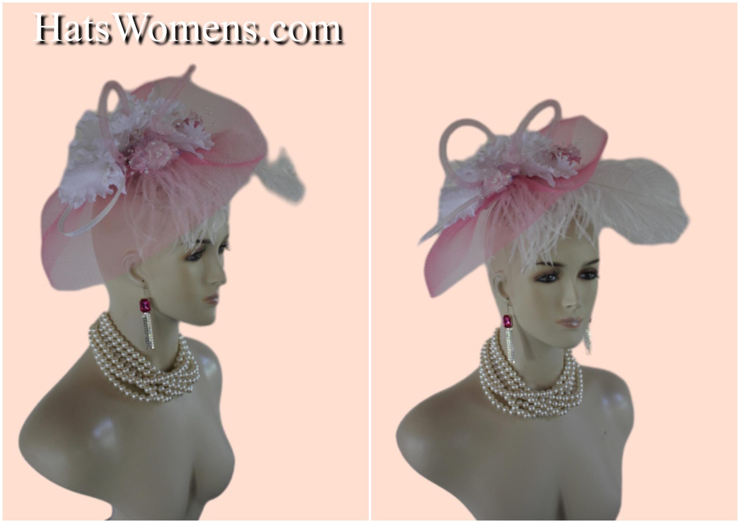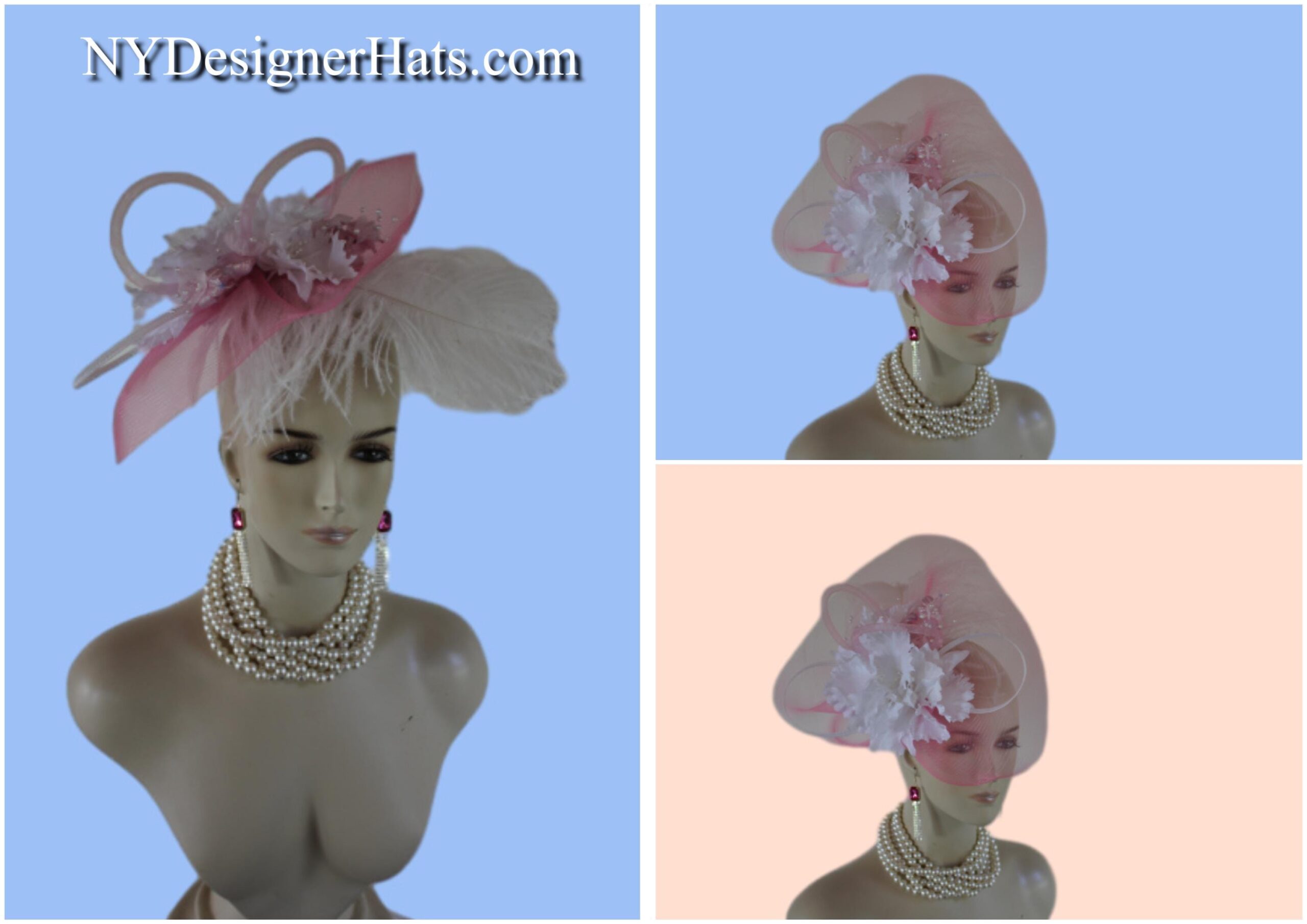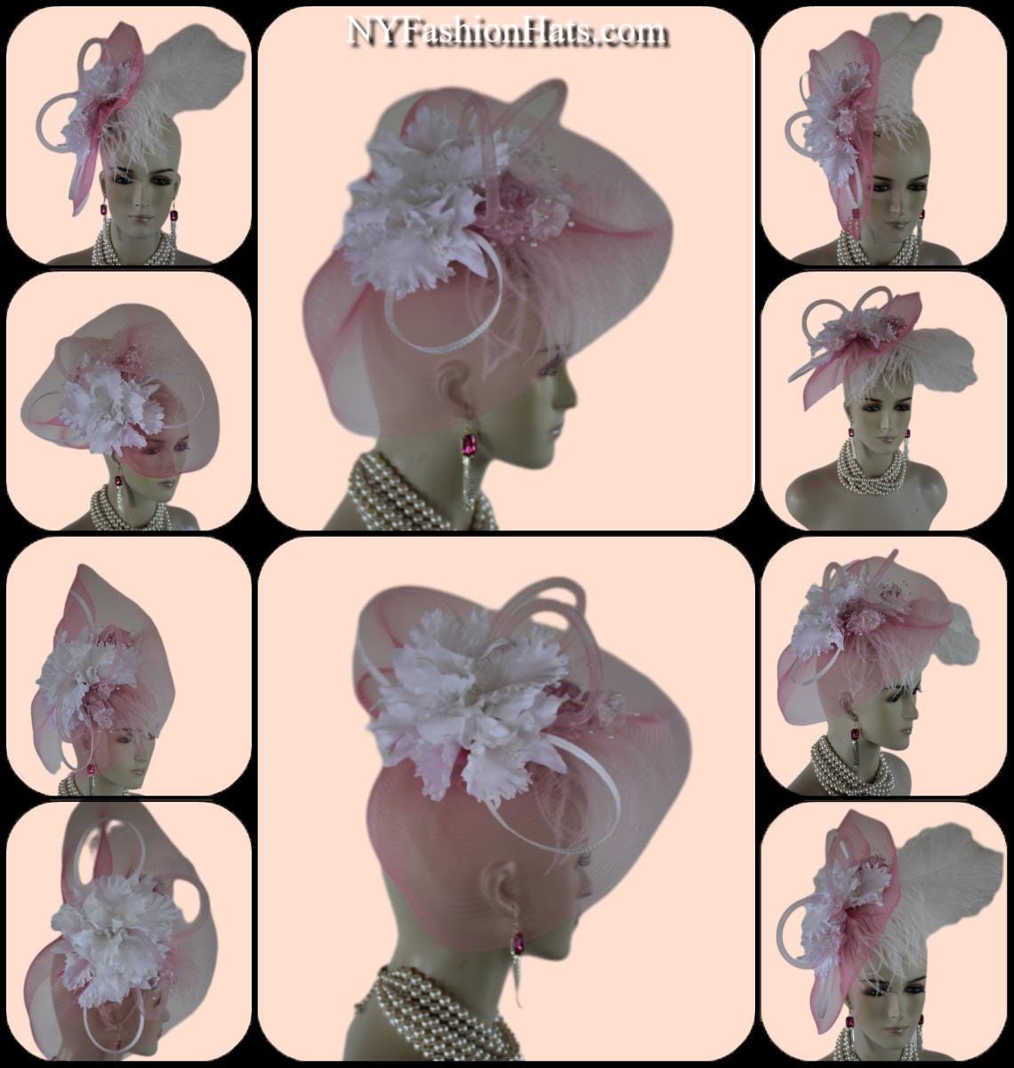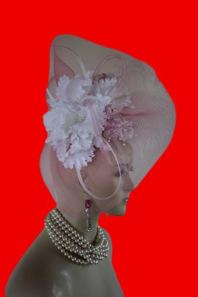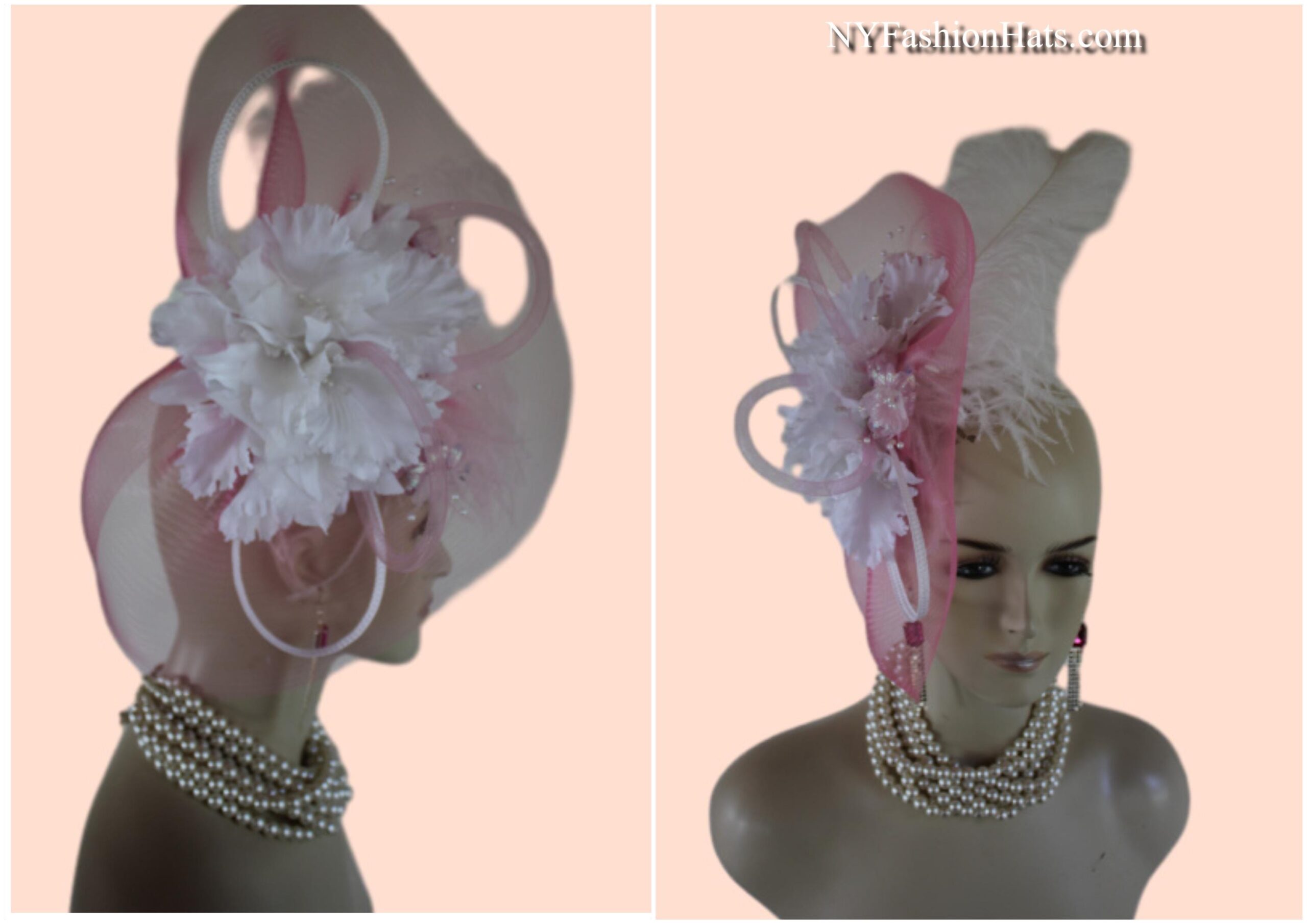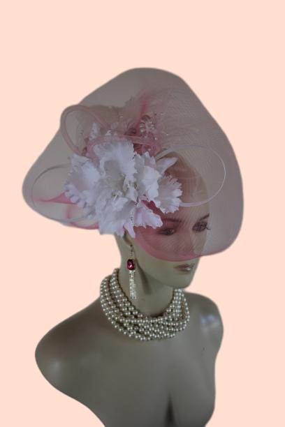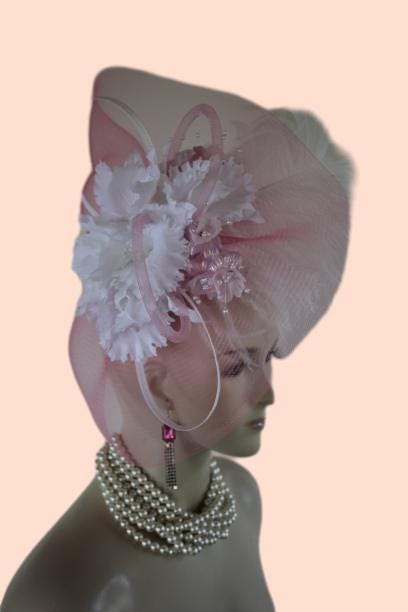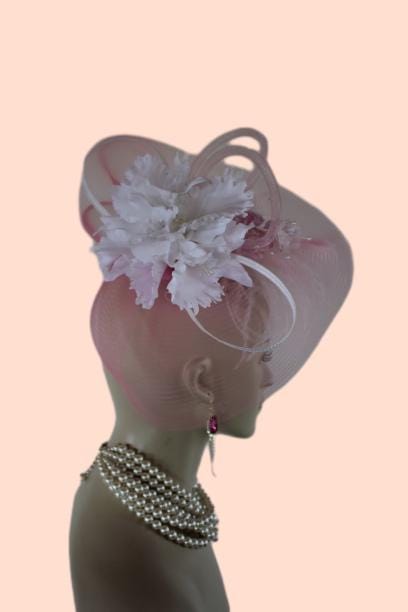 Couture Millinery For Women,An Alligator Clip Holds The Hat In Place,Hair Comb On Hat,NY Fashion Hats Millinery Headwear Apparel,Loop Fascinator Mother Of The Bride,White Pink Wedding Bridal Designer Fascinator,White Poly Braid Loop Bowing,Pink Loop Horsehair Crinoline Bowing,Vintage Handmade White Orchid Silk Flowers,Pink Iridescent Vintage Silk Flowers,Fluffy White Ostrich Feather