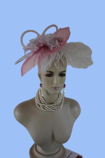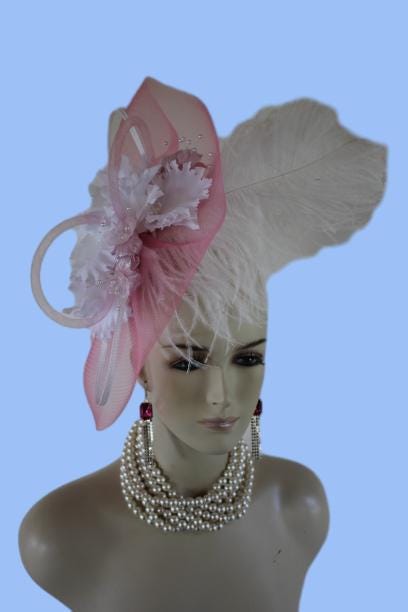 Exquisite Loop White And Soft Pink Fascinator Wedding Bridal Hat. This Dress Cocktail Fashion Hat Is Embellished With A Large Pink Horse Hair Crinoline Bow Enhanced With White Poly Braid Loop Bowing Mixed In With Pink Tubular Horsehair Crinoline Bowing. Place Within This Intricate Bow Are Vintage White Handmade Orchid Silk Millinery Flowers. Pink Iridescent Vintage Silk Flowers With Shooting Pearl Pecks Are Mixed Within The Orchids. To Top Off This Amazing Headpiece A Thick Ostrich Feather Is Added For A High End Design. This Hat Is Truly Beautiful. This Fascinator Can Be Worn In Any Position On The Head.