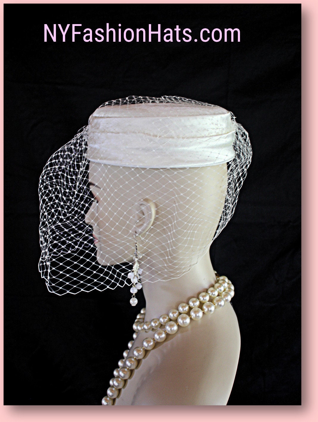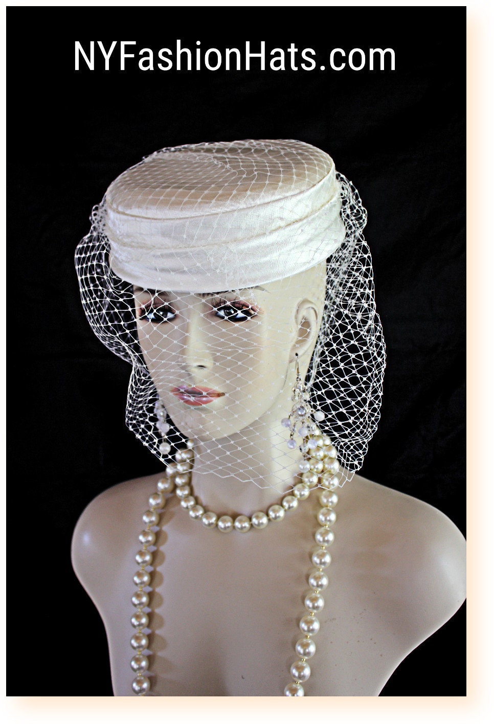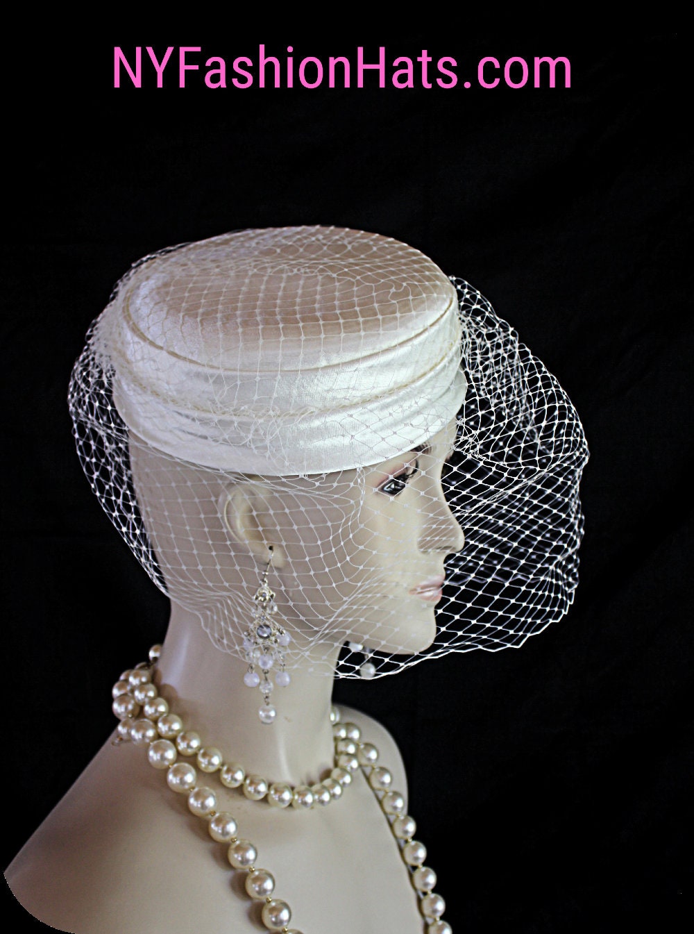 Material: Soft Beige Or Ivory Satin Pillbox Hat With Birdcage Veiling