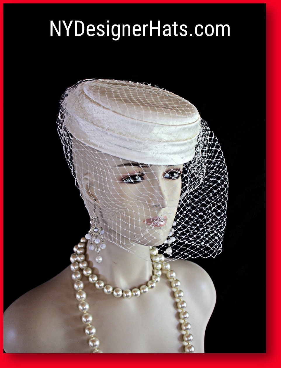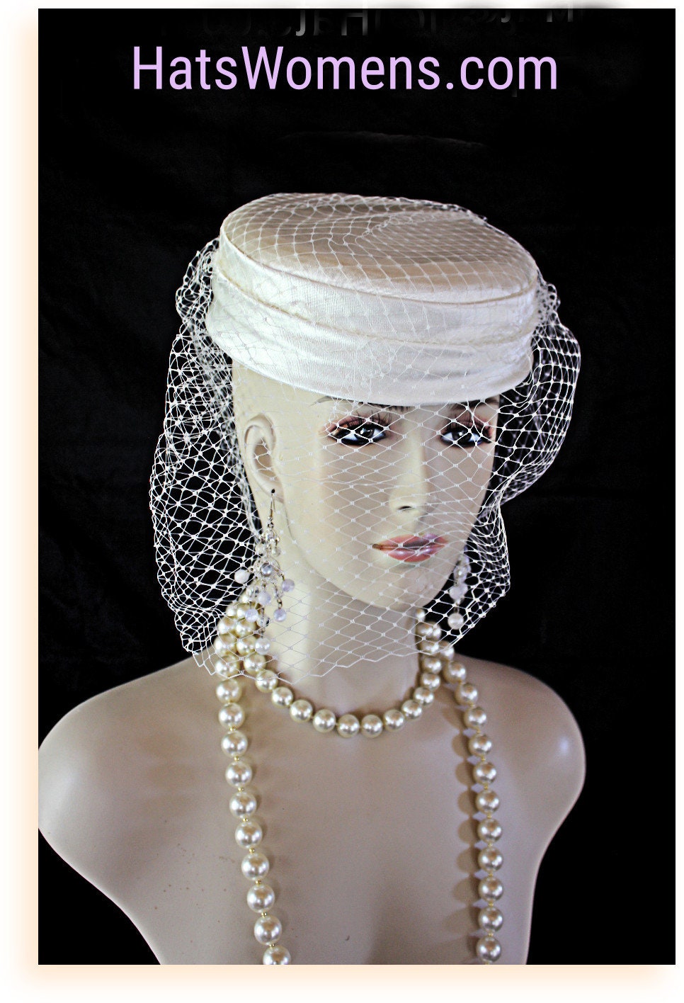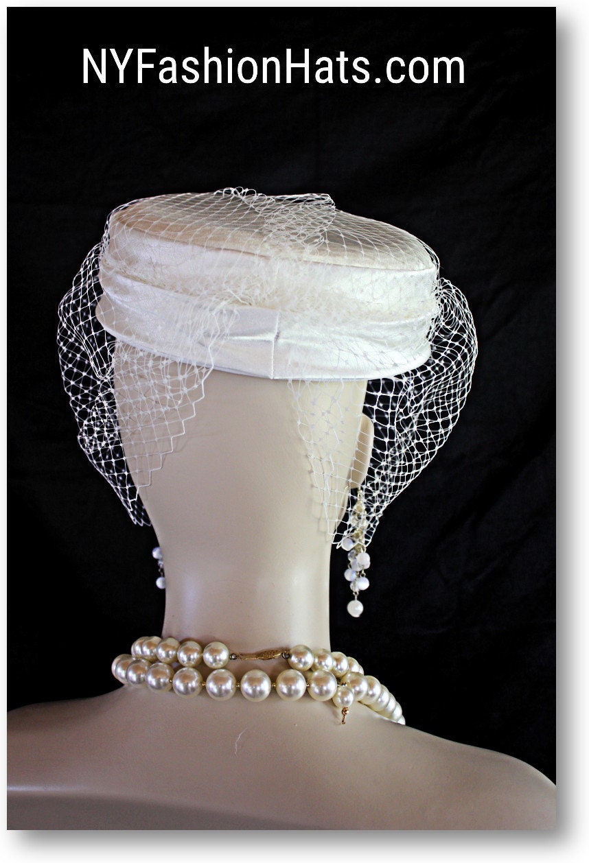 Ladies Hand Made Ivory Or Soft Beige Satin Pillbox Couture Designer Hat With A Face Veil. This Exclusive Fashion Hat Is Trimmed With A Birdcage Face Netting Veil And A Large Birdcage Netting Veil. This Hat Is Simple But So Elegant. Classic In Design. This Versatile Hat Can Be Worn In Different Positions To Complement Your Facial Structure. The Veil Can Be Worn To Cover The Face Partially Or Toward The Back Of The Head. This Hat Is A Show Stopper And Will Make A Fashion Statement. This Flattering Hat Is Suited For Winter, Spring, Summer Or Fall.