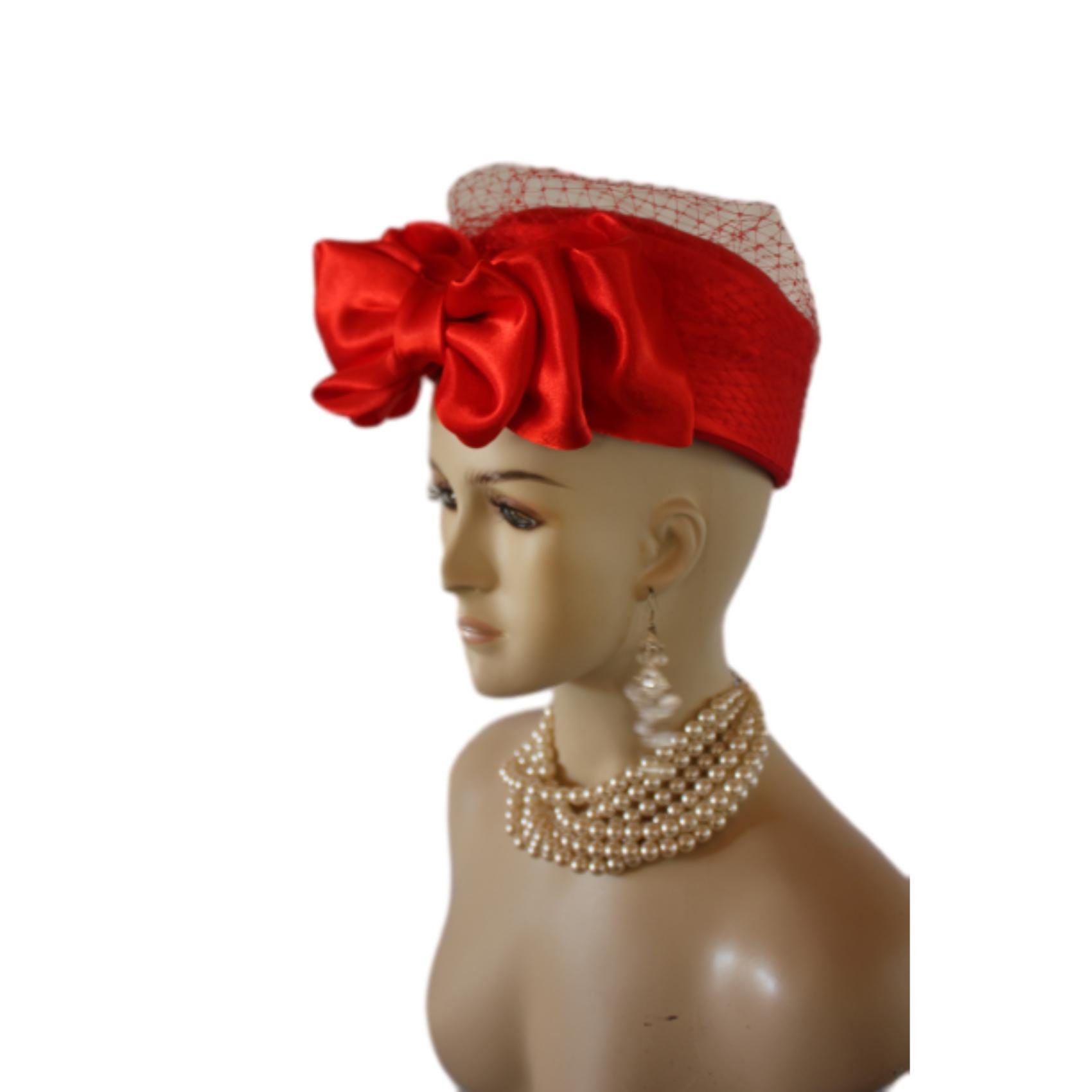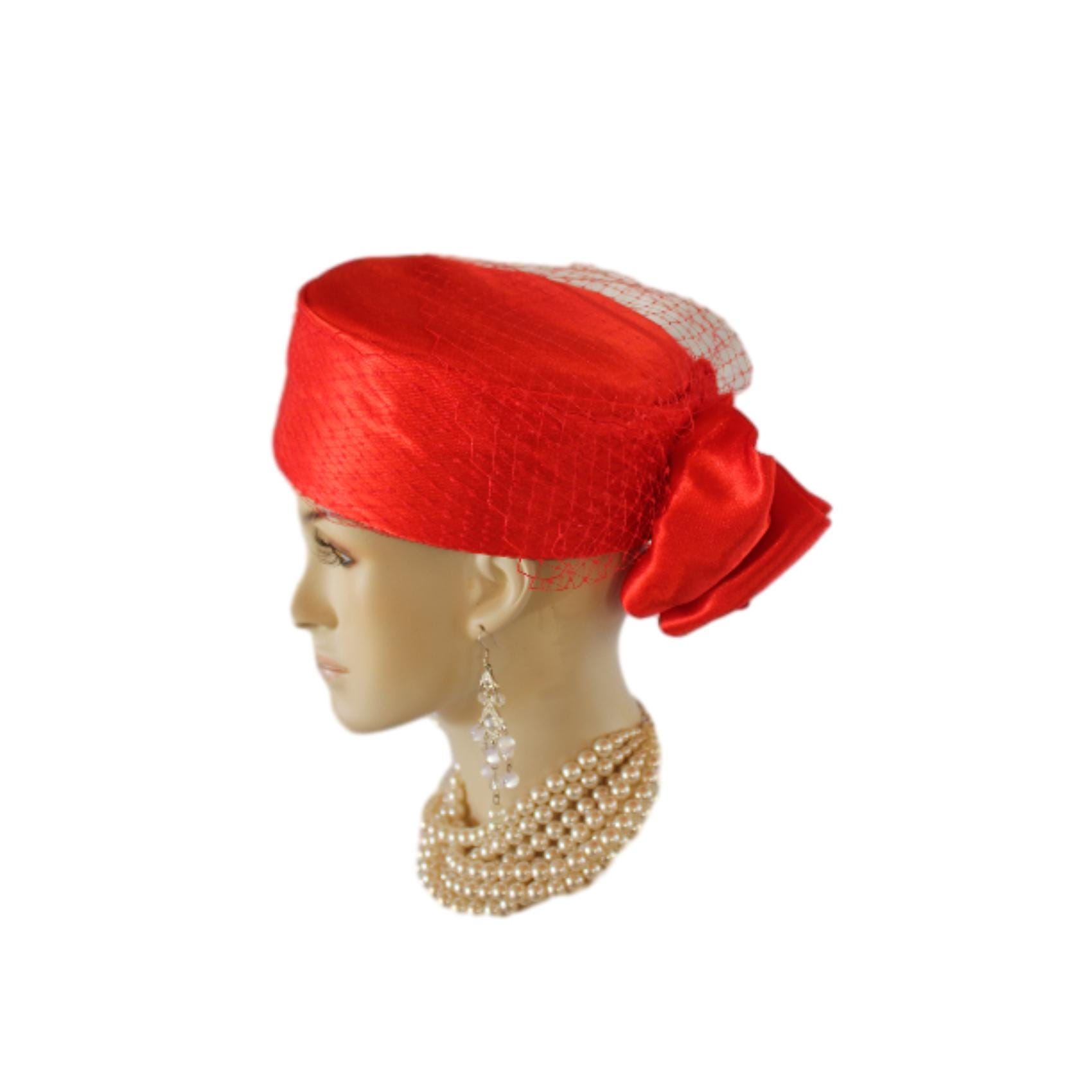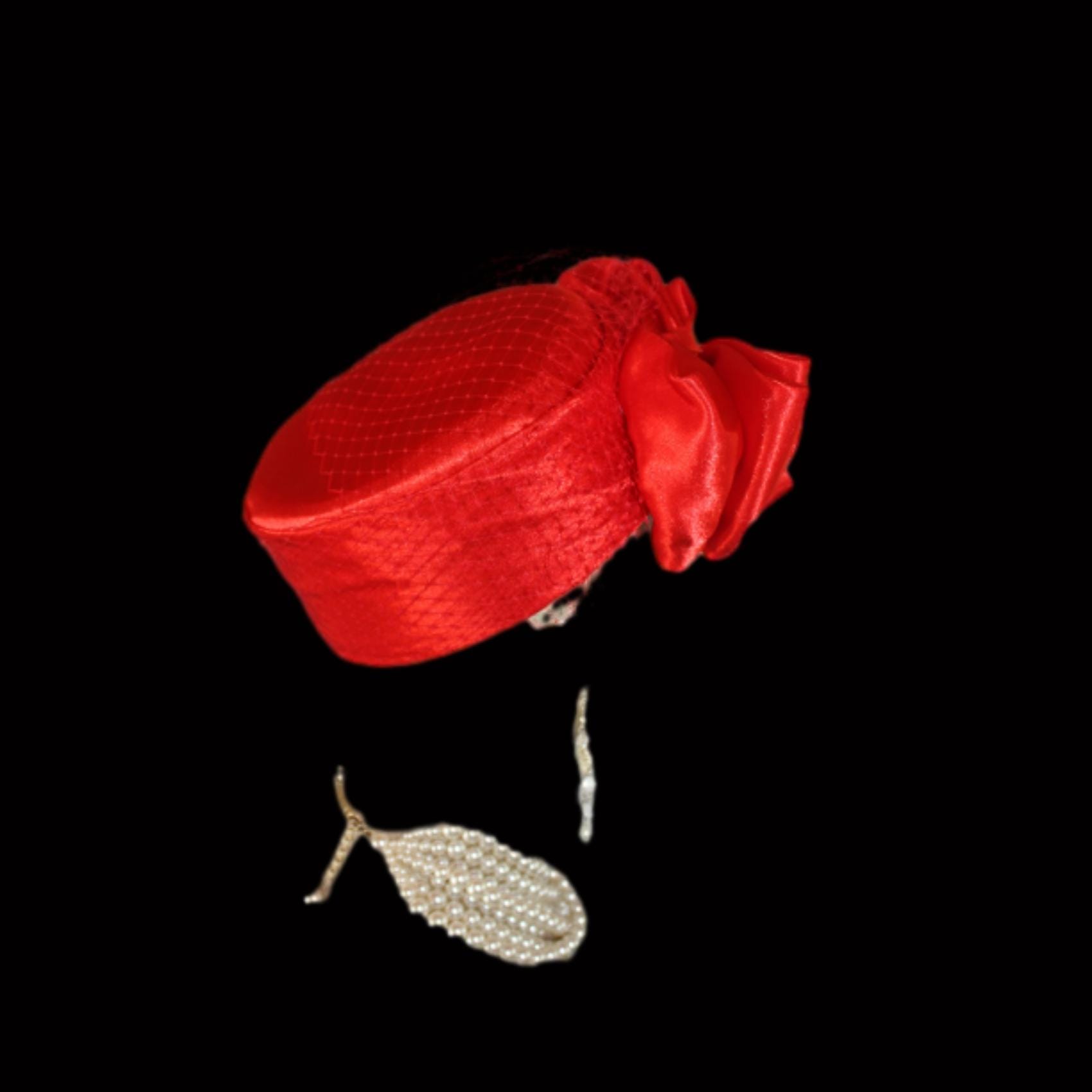 NY Fashion Hats Millinery Headwear Apparel,Square Crown Style Pillbox Hat,Large Satin Bow,Birdcage Netting On Top Of Crown,Some Birdcage Netting On Hat,Red Formal Satin Pillbox Wedding Bridal Hat,Custom Pillbox Hats For Women