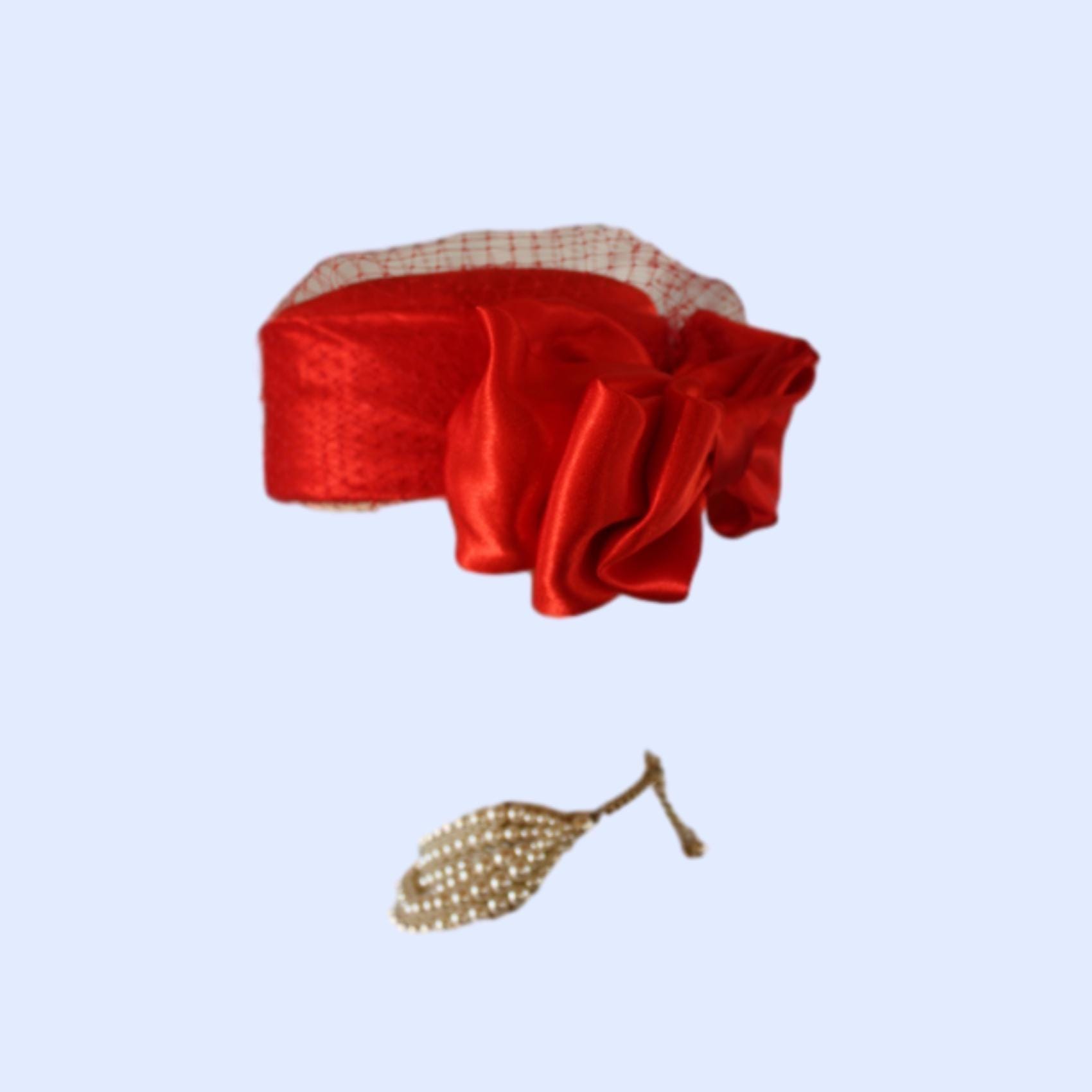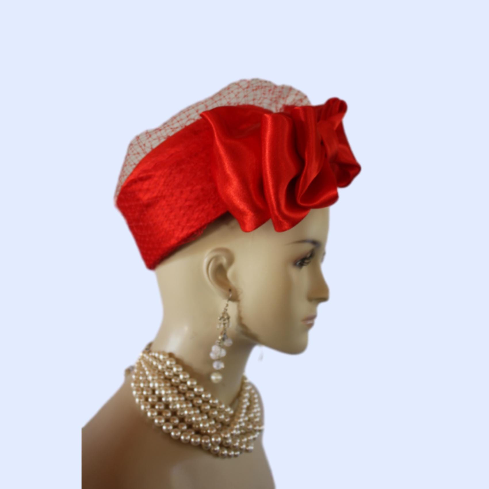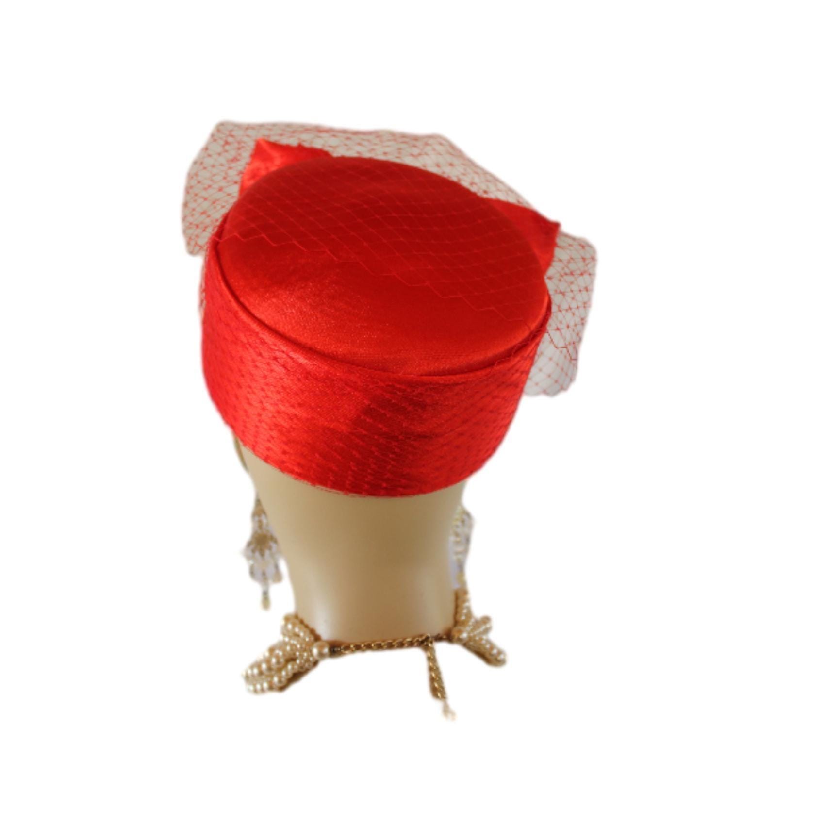 NY Fashion Hats Millinery Headwear Apparel,Square Crown Style Pillbox Hat,Large Satin Bow,Birdcage Netting On Top Of Crown,Some Birdcage Netting On Hat,Red Formal Satin Pillbox Wedding Bridal Hat,Custom Pillbox Hats For Women