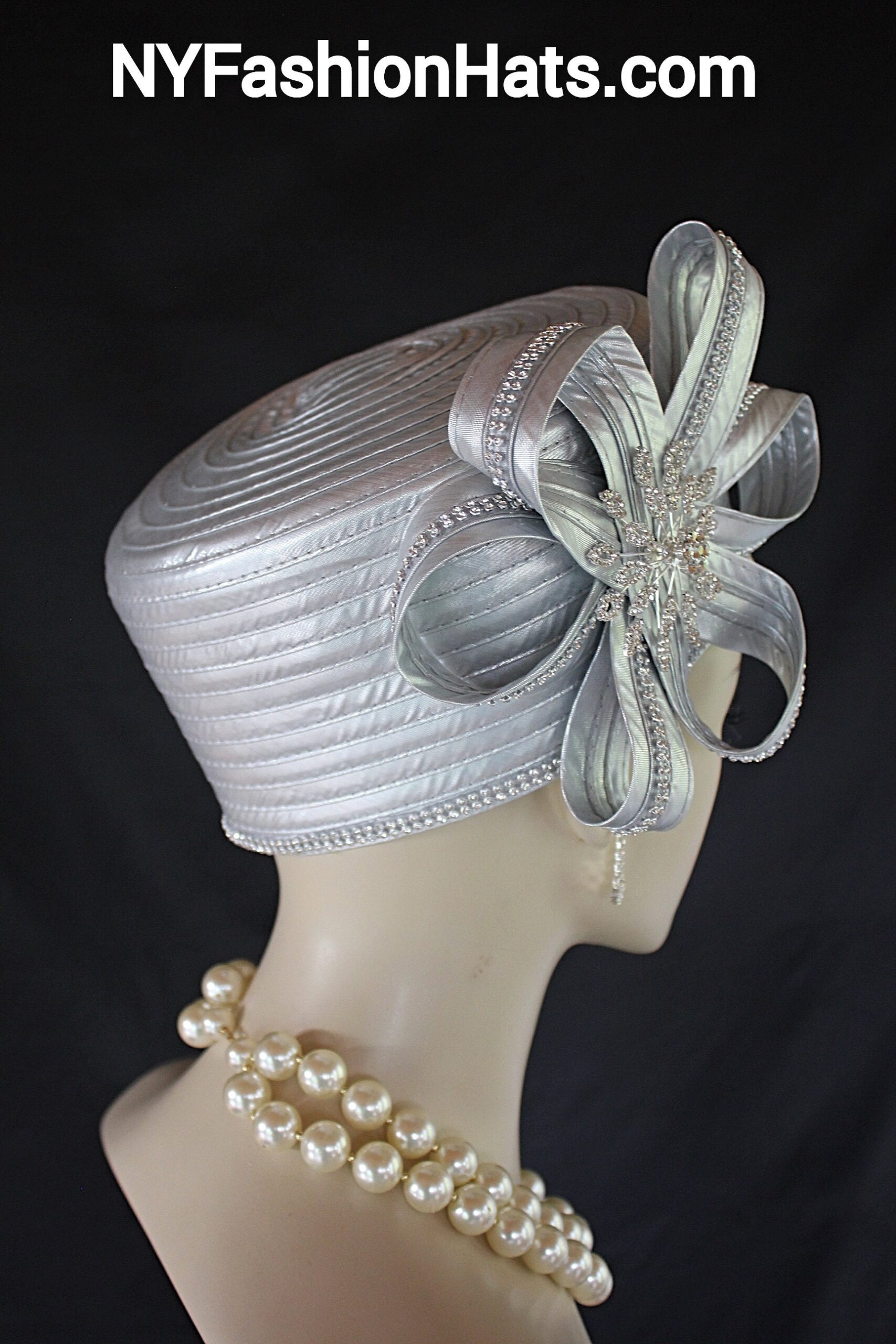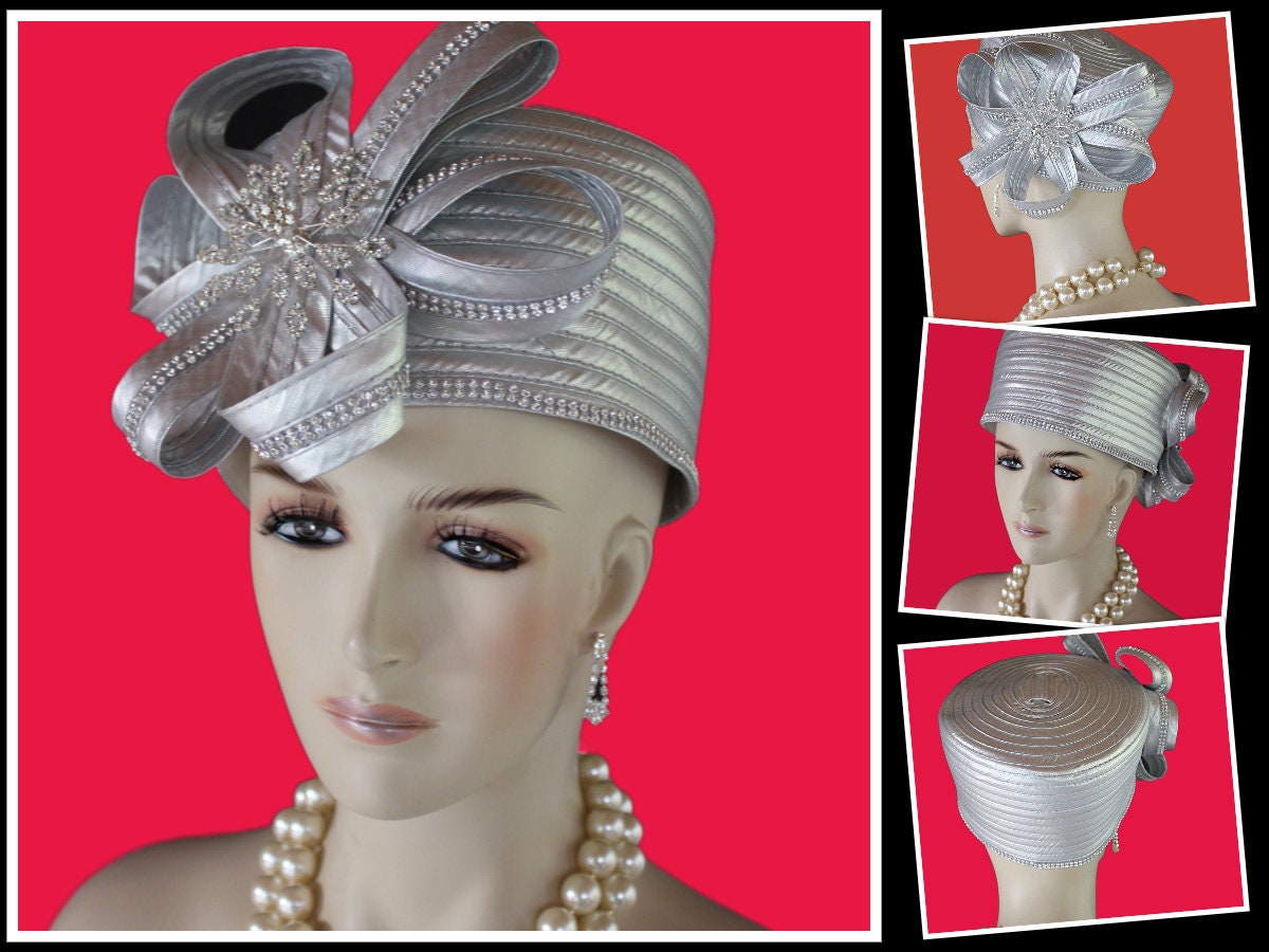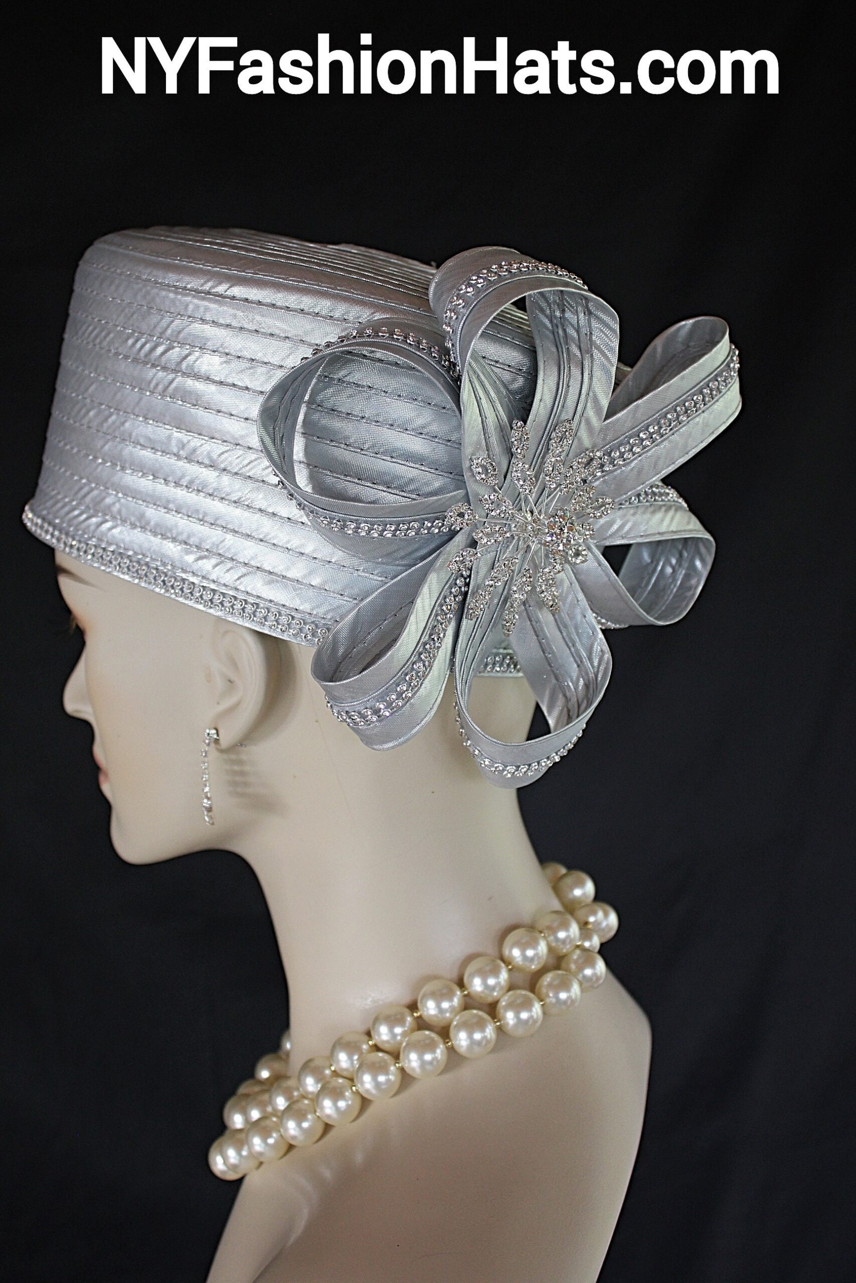 Women’s Metallic Silver Satin Haute Couture Formal Pillbox Hat. Formal Cocktail Wedding Church Hat. This Classic Styled Metallic Silver Dressy Pillbox Holiday Hat Is Embellished With A Satin Bow Enhanced With Rhinestones. This Bridal Mother Of The Bride Headpiece Can Be Worn With Embellishments Toward The Face Or To The Back Side Of The Head. This Elegant Satin Pillbox Hat Is Custom Made And Designed By NY Fashion Hats Couture Millinery. https://www.nyfashionhats.com. This New Collection Headpiece Is Part Of The Anastasia Konstandina Couture Headdress Line.