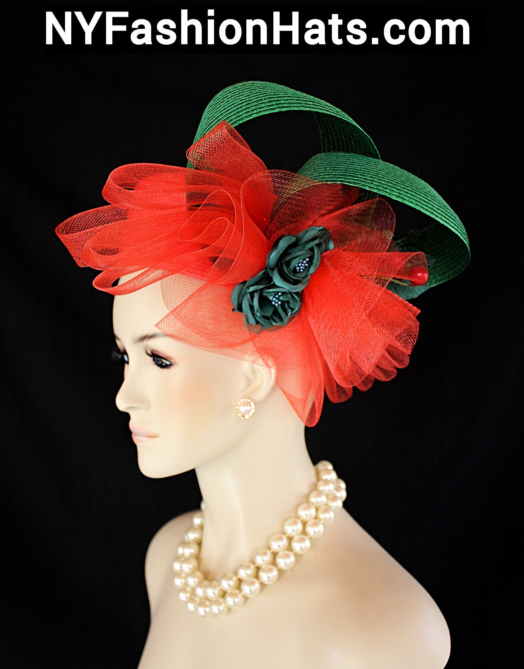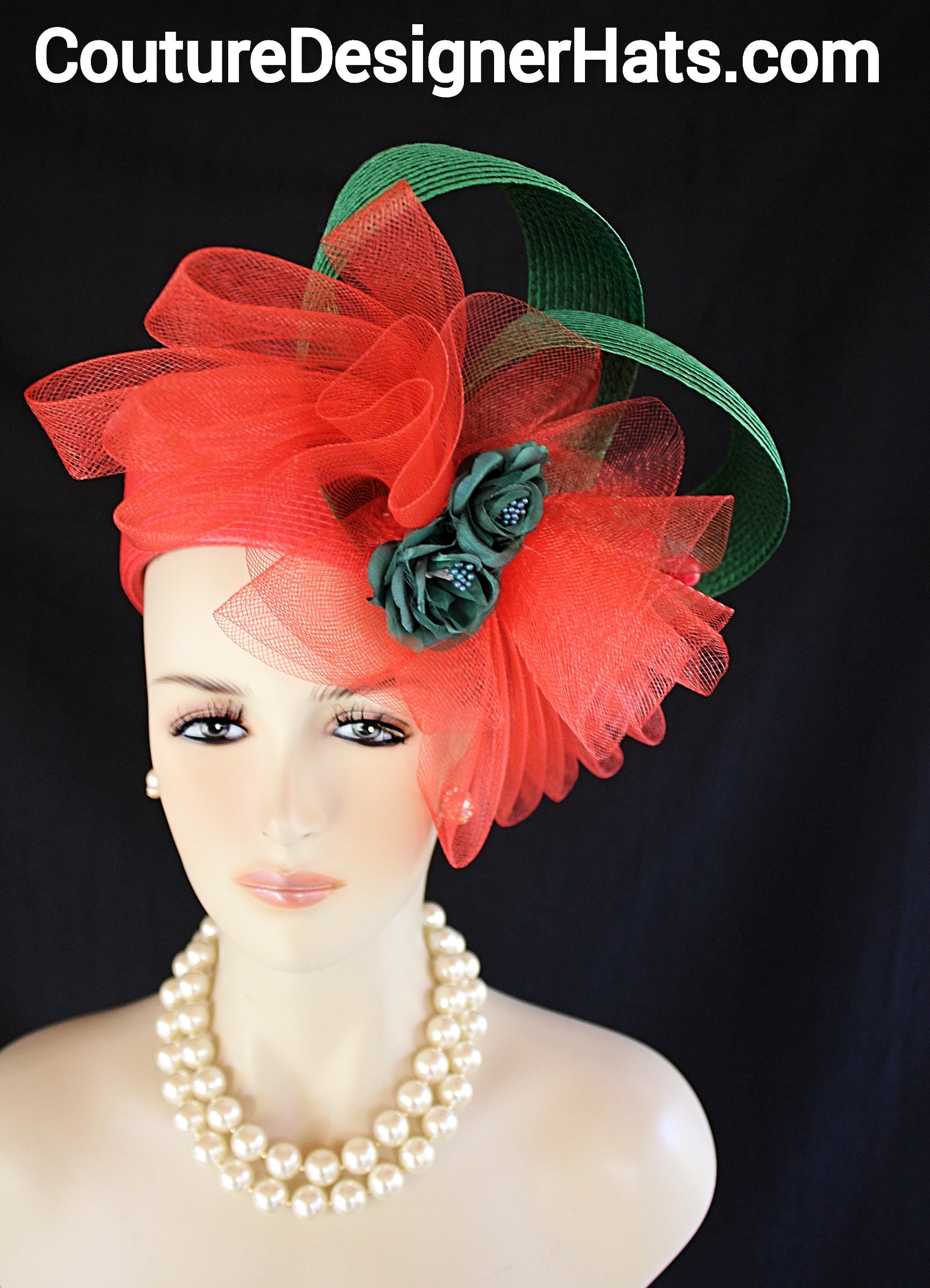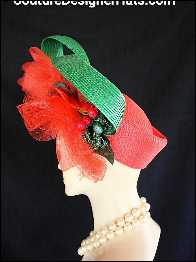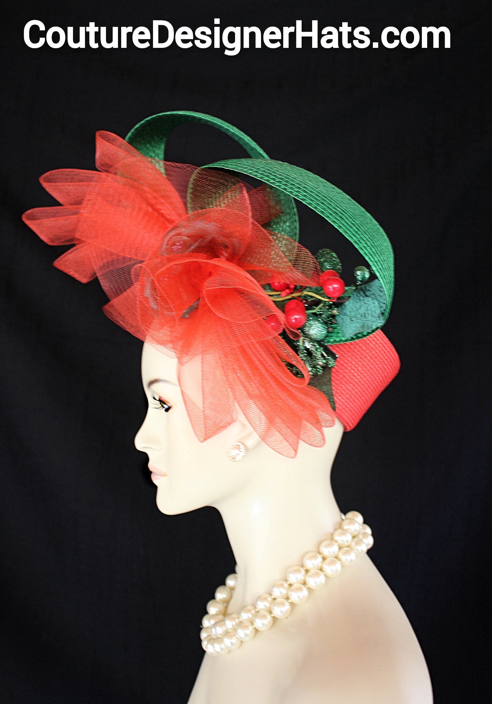 This ladies bespoke couture formal designer wedding fascinator red and green hat is appropriate to wear for Christmas Holiday parties, office parties, horse races, formals, Church, weddings, bridal showers, and special occasion. This statement hat is also suited for mother of the bride or a bride for A Christmas wedding. This Unique Hat Will Make A Fashion Statement.