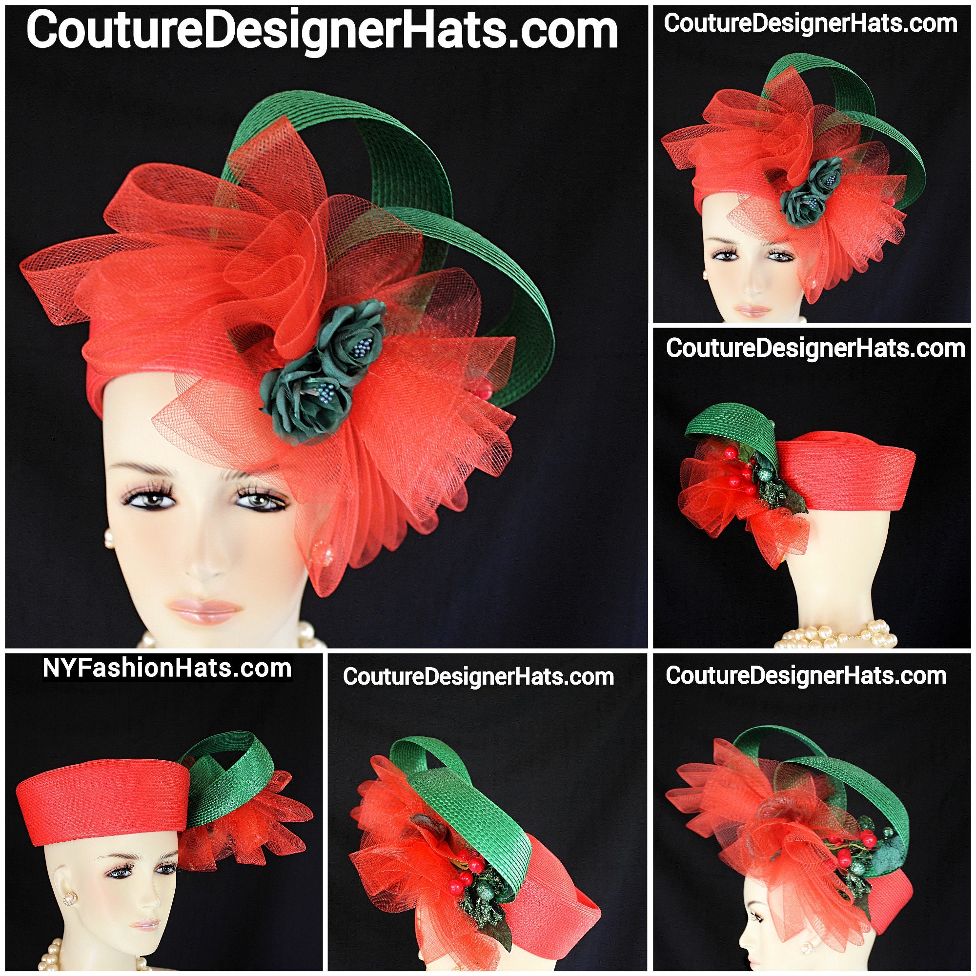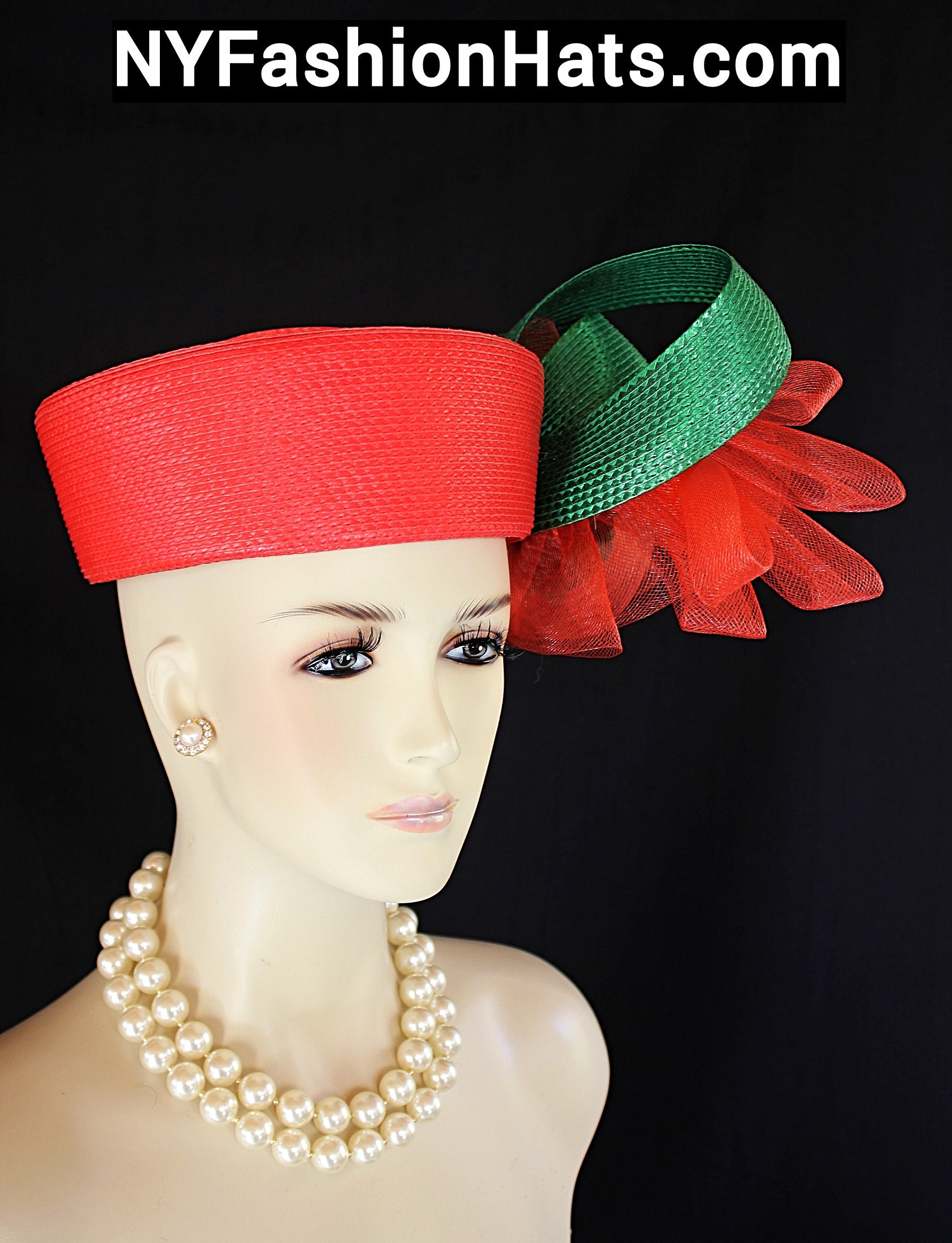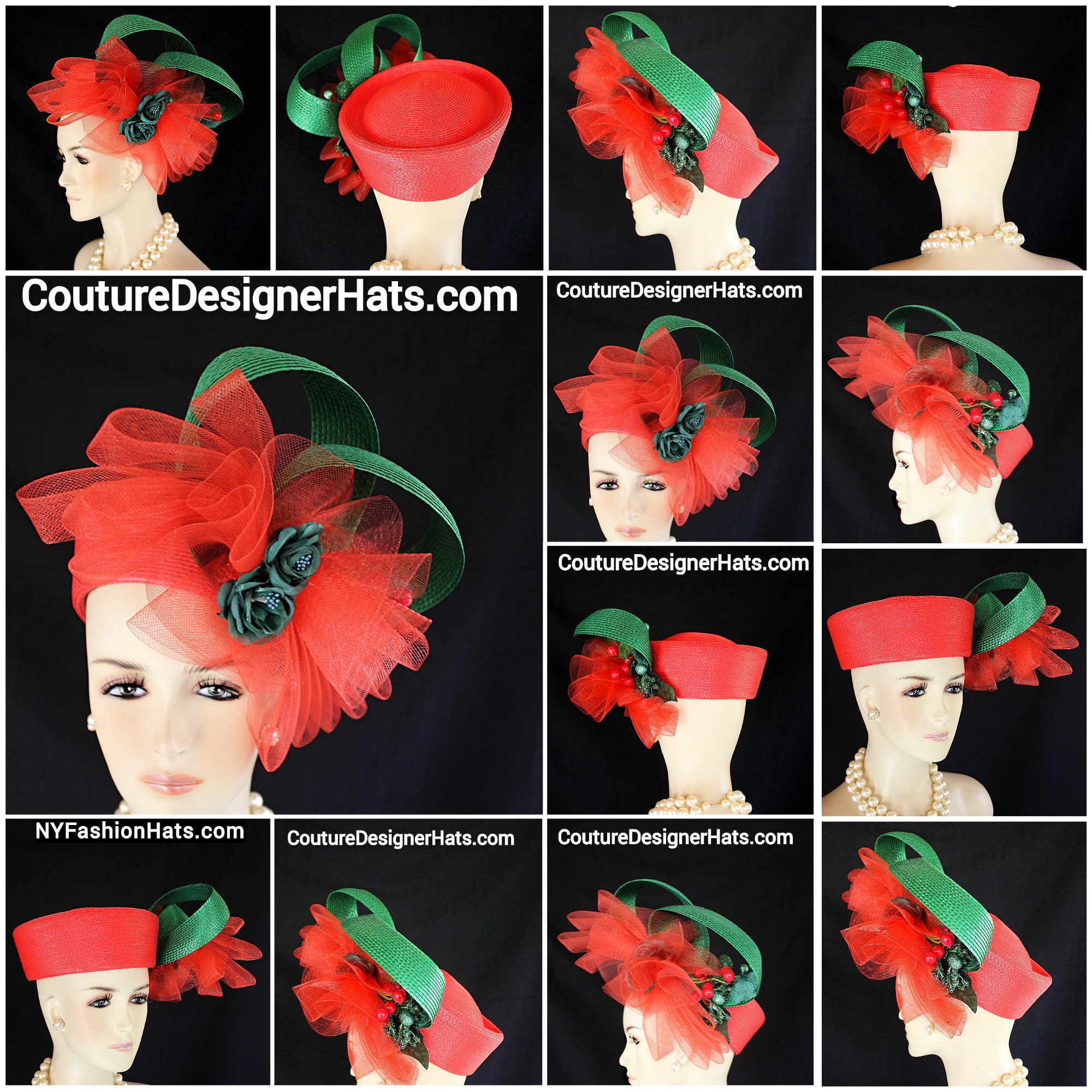 NYFashionHats Headwear Apparel,CoutureDesignerHats Millinery For Women,Custom Headdress Apparel For Women,Each Hat Is Custom Made Per Order,Shaped Sculptured Designer Pillbox Hat,Sculpture Shaped Art Pillbox Designer Hat,Red Pillbox Dress Fashion Hat For Women,Red Horsehair Crinoline Bow,Red Poly Braid Mother Of The Bride Hat,Red Green Christmas Wedding Pillbox Hat,Holiday Hat For Women,Special Holiday Pricing On This Holiday Hat