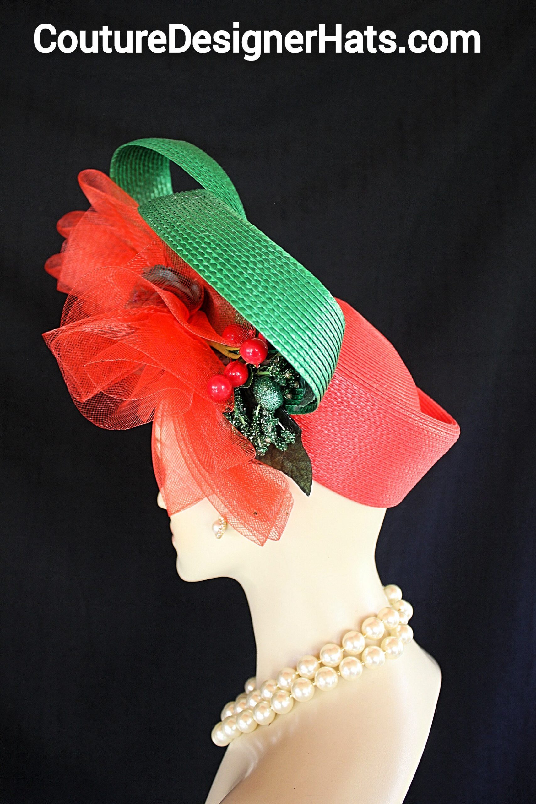 Red Green Christmas Pillbox Wedding Hat, Avant Garde NYFashion Hats, Church Dress Designer Formal Hat Women, Holiday Cocktail Party Hat, CM2