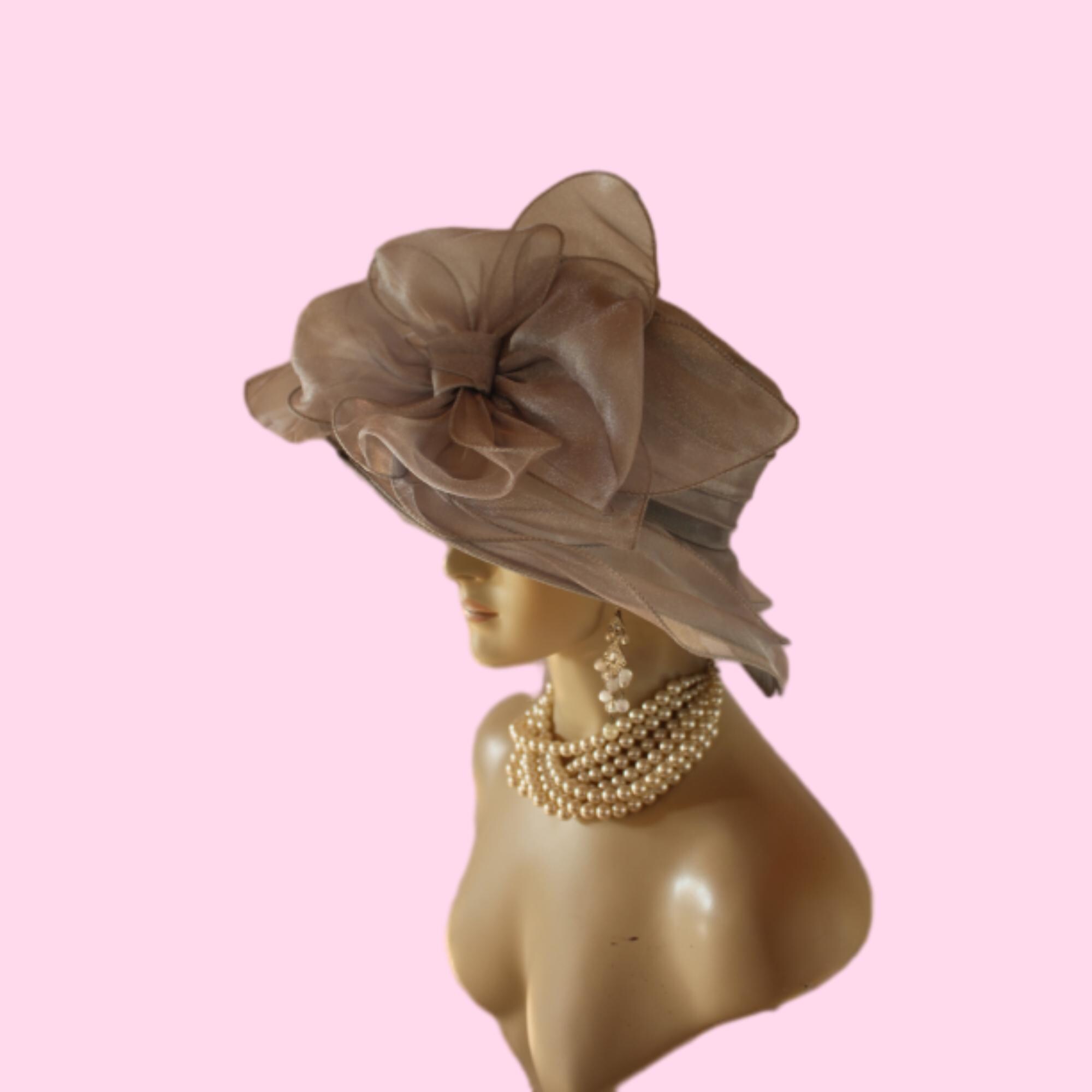 Ladies Silver Gray Sheer Soft Big Classic Designed Ruffle Brim Designer Dress Hat. This Old Hollywood Vintage Inspired Fashion Hat Is Embellished With A Large Organza Fabric Decorative Bow, Enhanced With Large Organza Handmade Millinery Flower Petals. Delicate Pink Coque Feathers Are Placed Within The Beautiful Bow For A Feminine Romantic Look. A Sheer Organza Band Is Placed Around The Crown For A Simple Elegant Appearance.