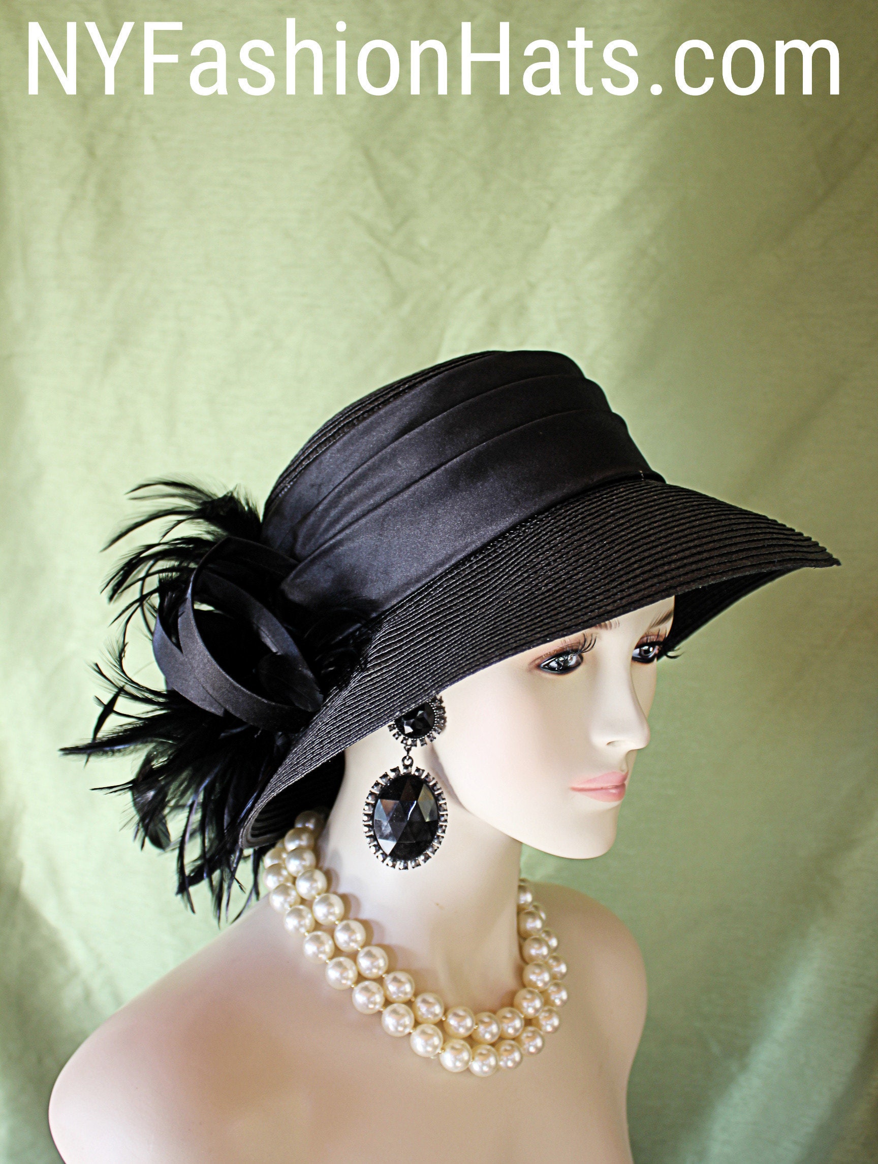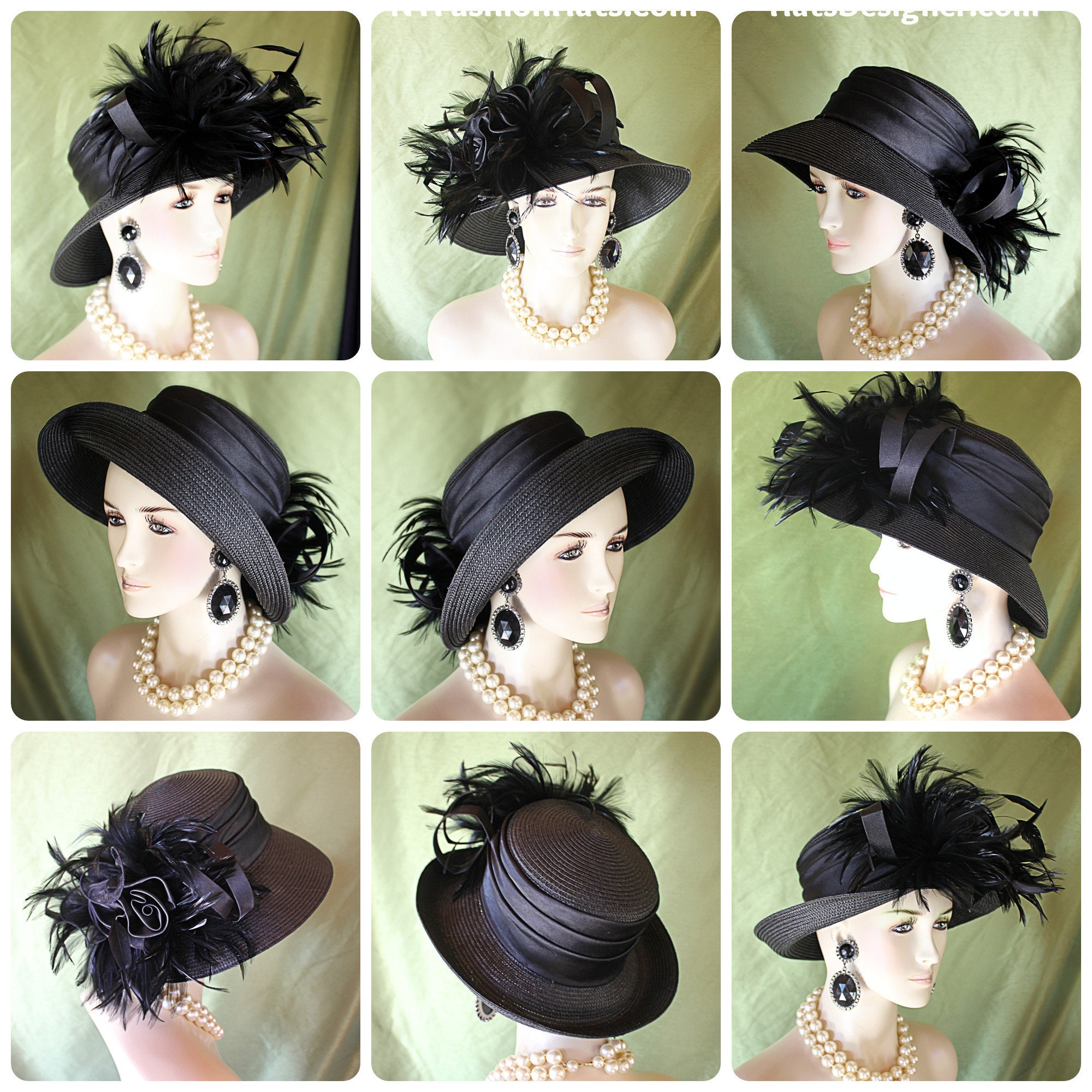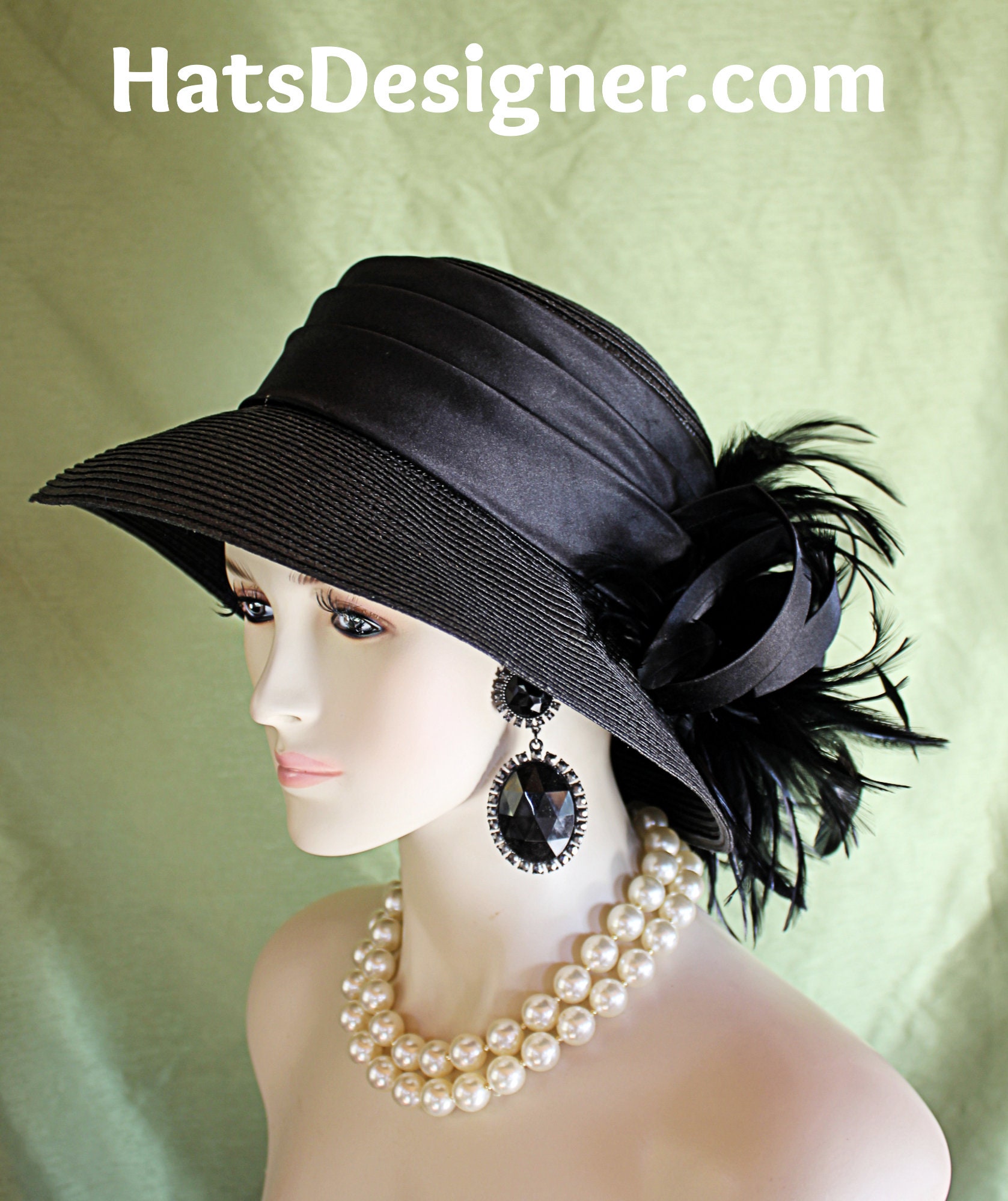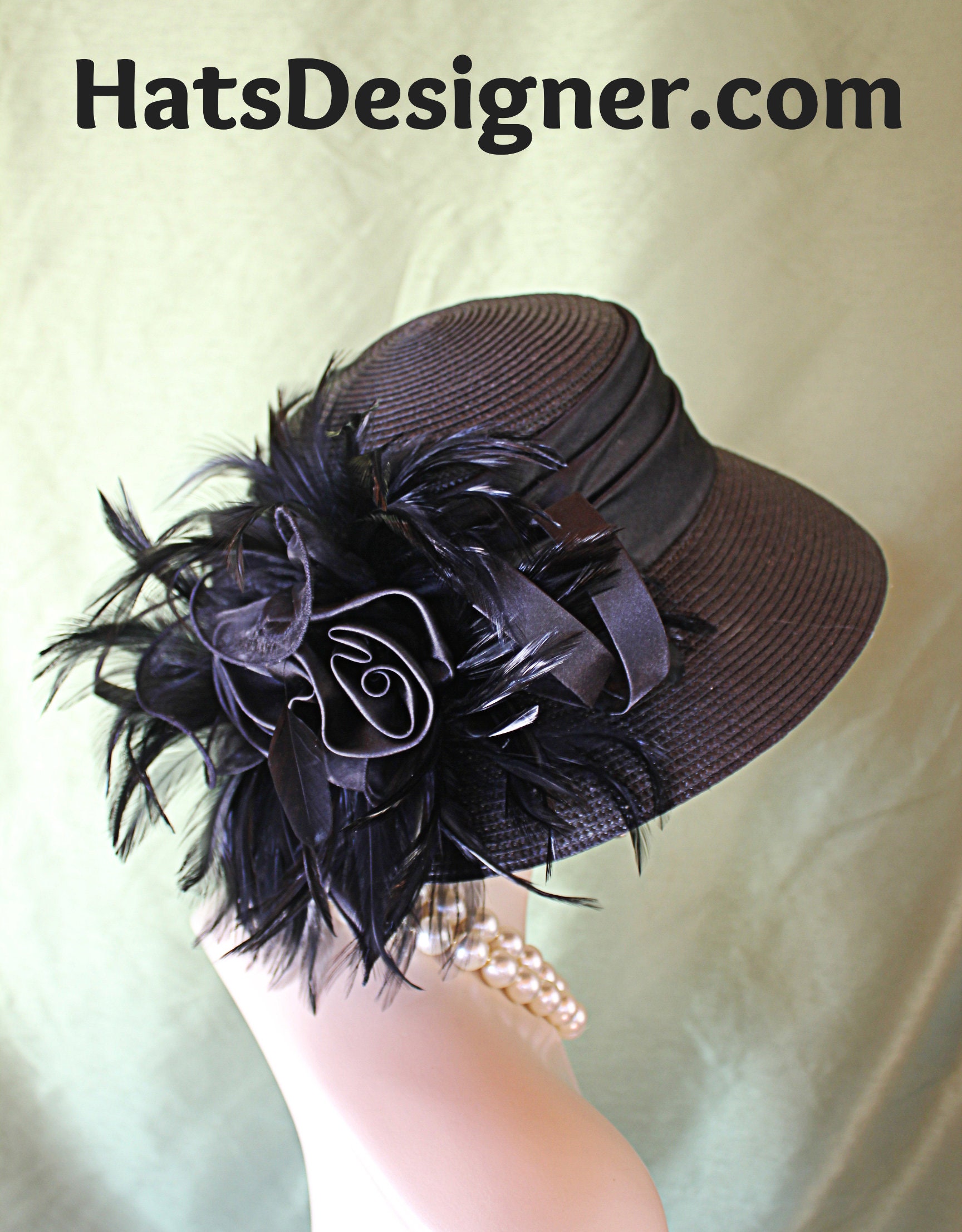 Black Haute Couture Avant Garde Designer Hat For Women. This Hand Made Motf Premium Black Fashion Dress Hat Is Trimmed With A Large Black Satin And Organza Handmade Large Rosette Bow. Placed Within This Beautiful Bow, Are Expensive Black Hackle Feathers. A Black Satin Hat Band Encircles The Crown Of This Elegant Ladies Hat. This Designer Custom Made Hat Is A Show Stopper. Suited For Winter, Spring, Summer And Fall. This Couture Hat Can Be Customized To Match Your Wardrobe. This Hat Is Also Available In Ivory Dark Brown Red And Royal Blue. The Hat Can Be Completly Customized. Choose Between Your Hat Color, Bow Colors Are The Color Of The Hat, Customize Your Feather Colors To Match Any Outfit.