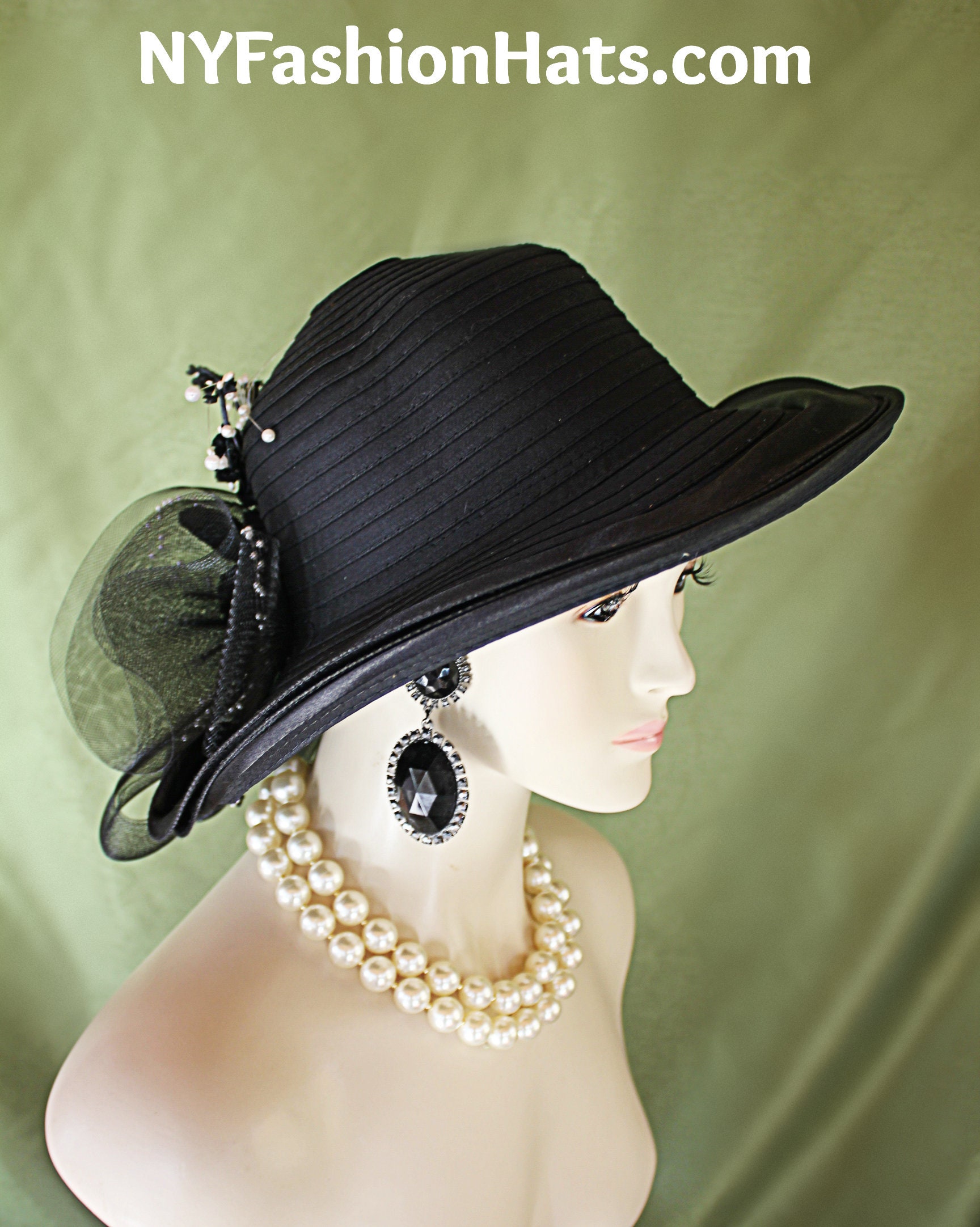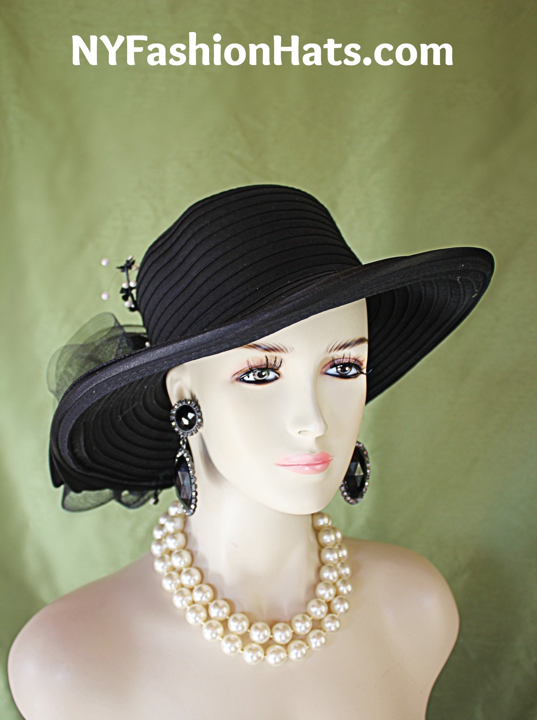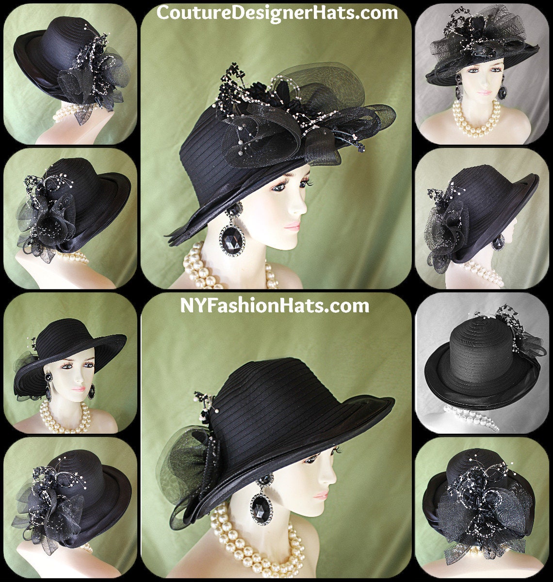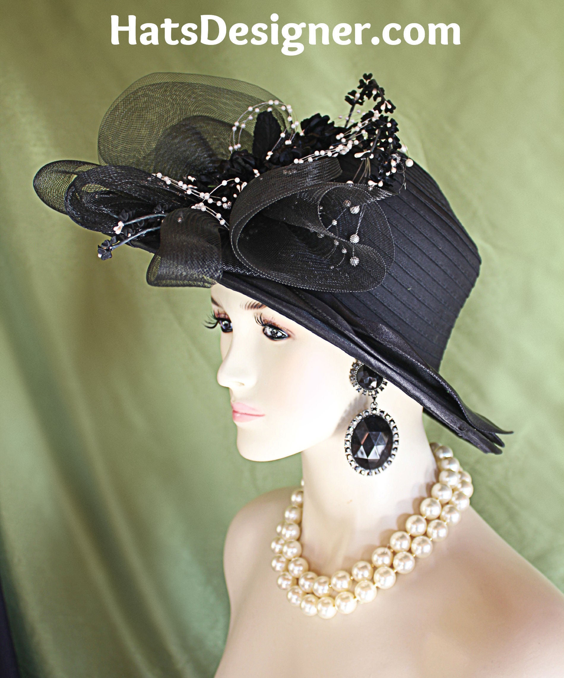 Custom Made Couture Designer Hat,NYFashionHats Haute Couture Millinery,Hat For Horse Races Custom Made Headwear,Mother Of The Bride Hat Customize,Satin Large Brim Hat,Black Crinoline Horsehair Bowing,Big Bow Black Satin Hat With Flowers,Black Silk Flowers White Pearls,Formal Custom Made Hat Per Order,Haute Couture Fine Millinery Apparel,Black Satin Ruffle Around Outside Of Brim