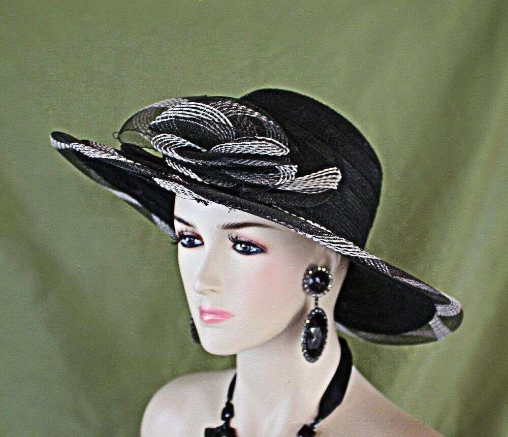 Black And White Fancy Decorative Wide Brim Couture Fashion Wedding Hat For Women. This Wide Brimmed Dress Hat Is Trimmed With A Large Sheer Crinoline Horsehair Bow. This Formal Hat Has A Beautiful Decorative Edge Brim. The Hat Can Be Worn With The Bow Toward The Front Of The Face Or Back Of The Head. This Kentucky Derby Hat Is Suited For Horse Races, Formal Events, Weddings, And Church. This Beautiful Lightweight Brimmed Hat Is Well Suited For A Bride To Be On Her Wedding Day, Also Appropriate For Wedding Guests.