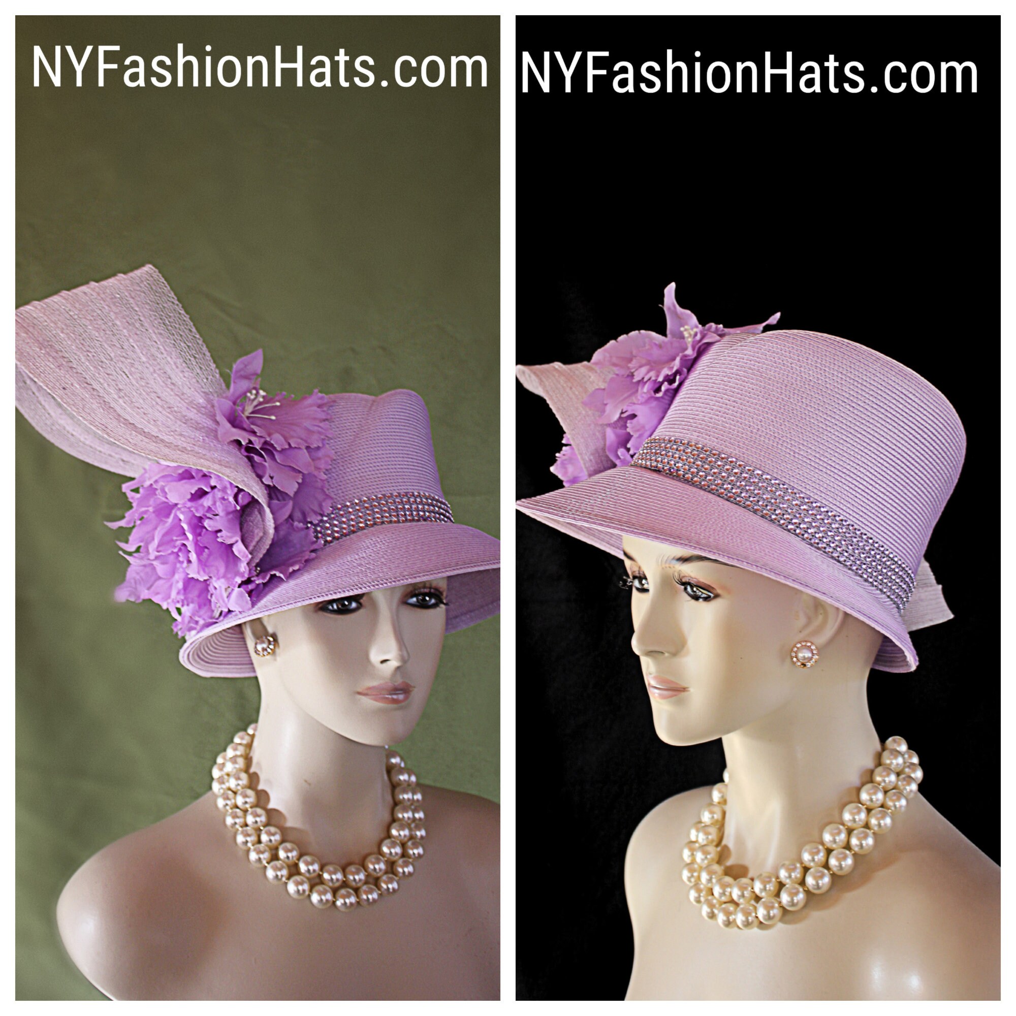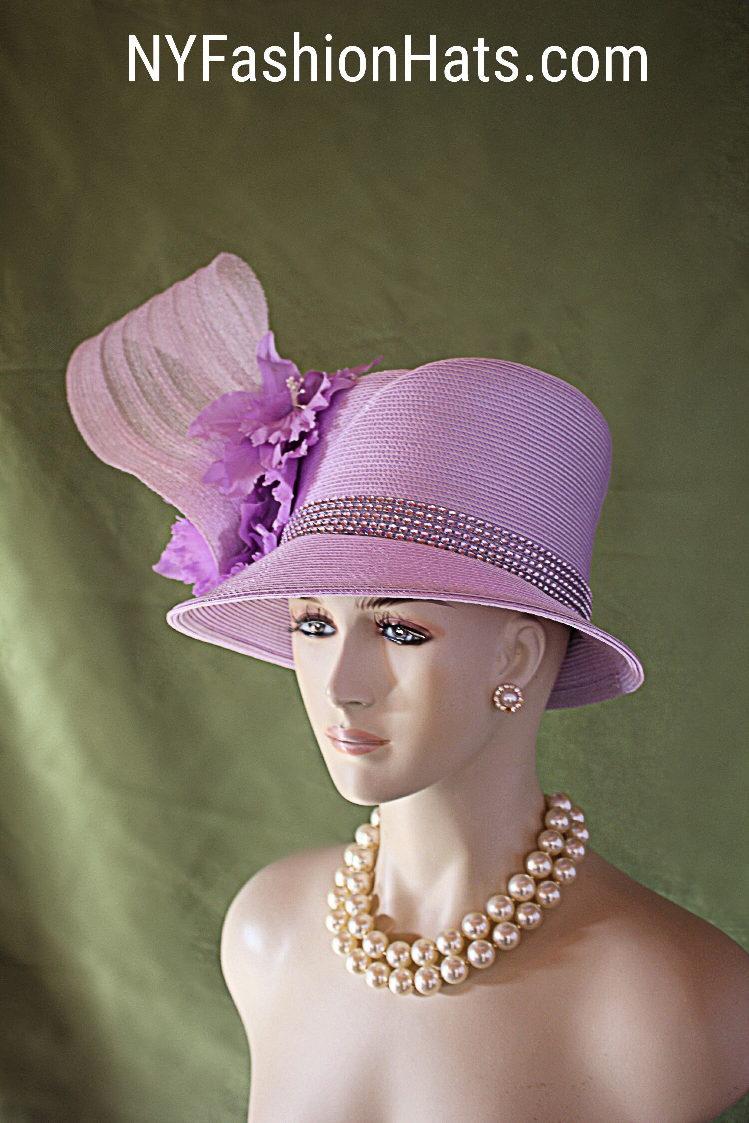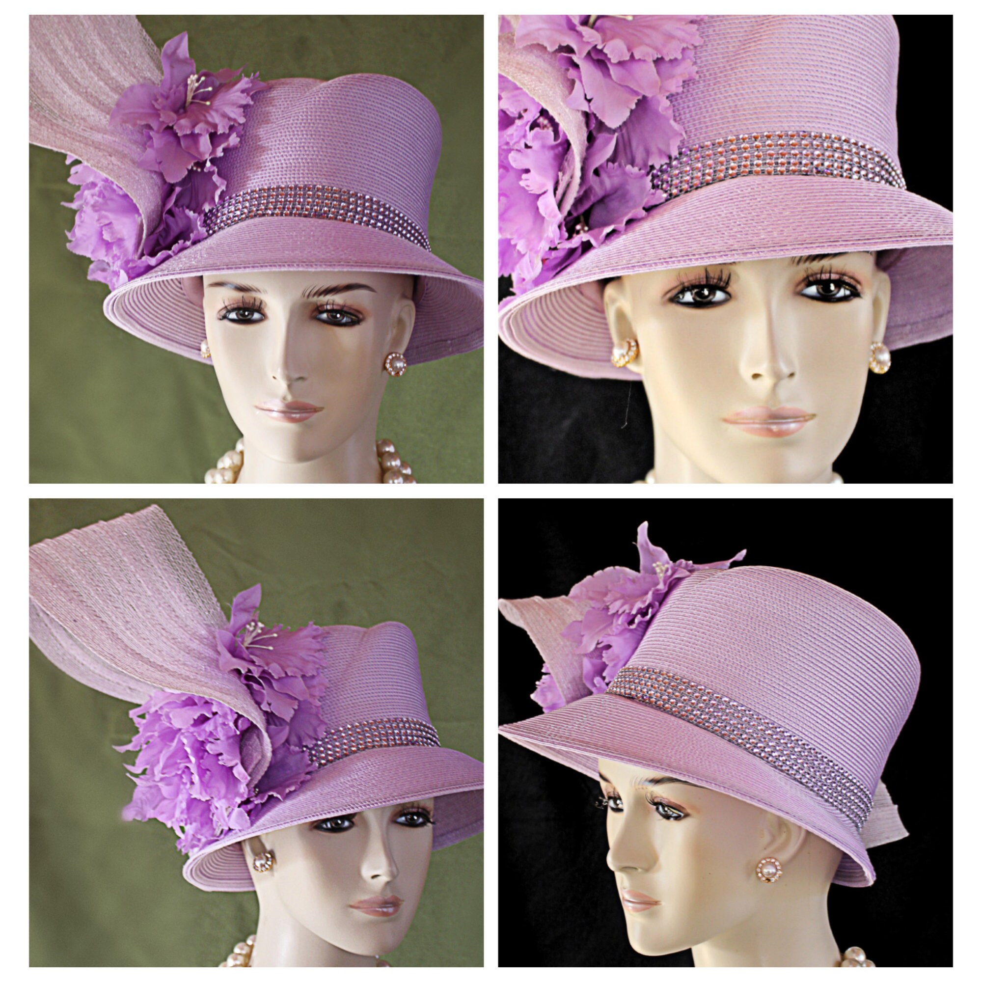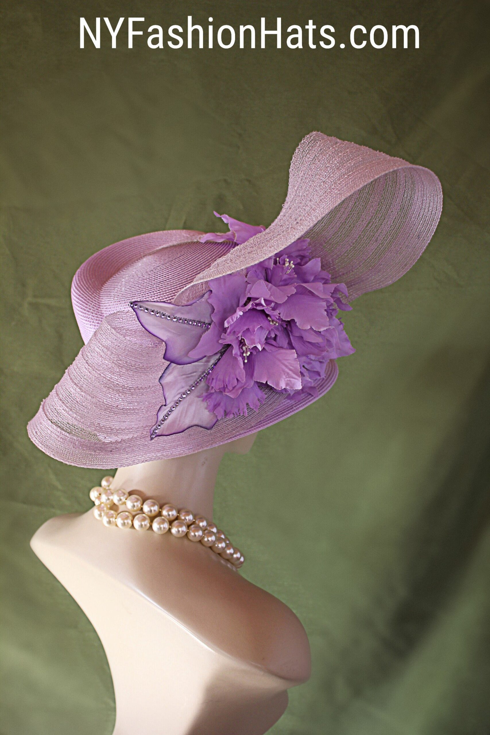 NYFashionHats Haute Couture Hat Millinery,Mother Of The Bride Hat Headpiece,Soft Purple Vintage Orchid Silk Flowers,Purple Haute Couture Luxury Designer Hat,Acrylic Rhinestone Trim,Handmade Sculptured Hat,Vintage Purple Silk Leaves Rhinestones,A Symmetrical Brim Hat,Shaped High Crown Hat,Purple Poly Straw Braid