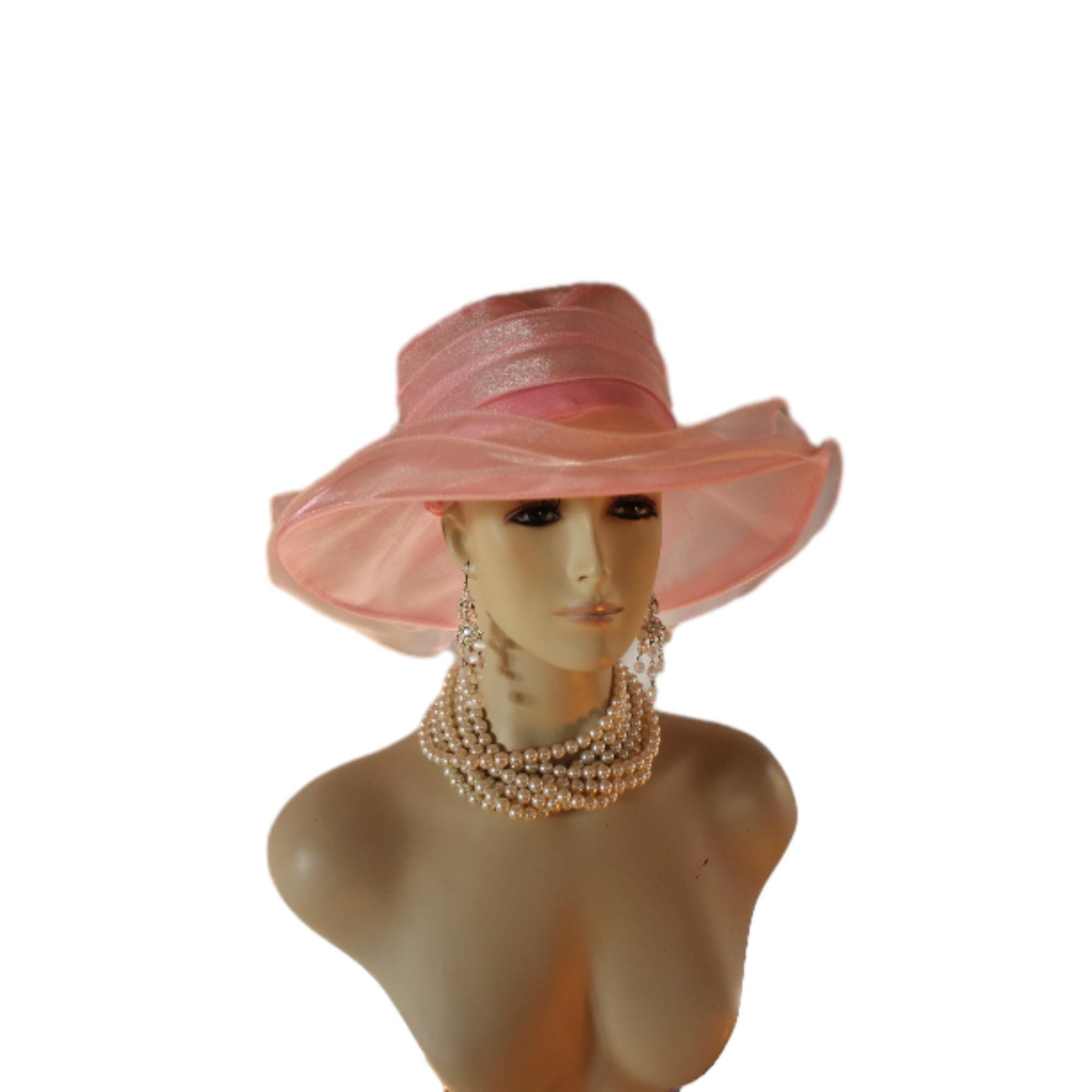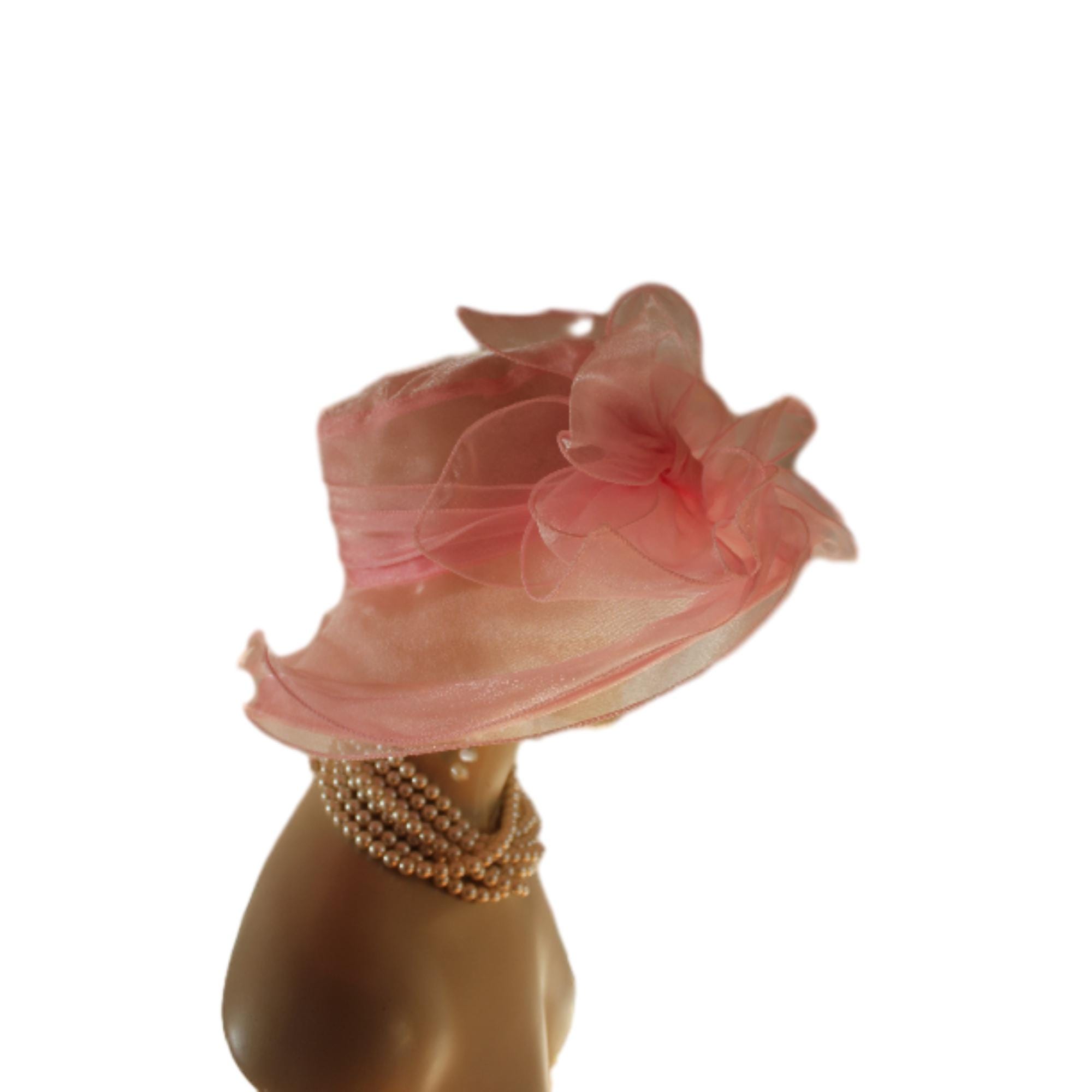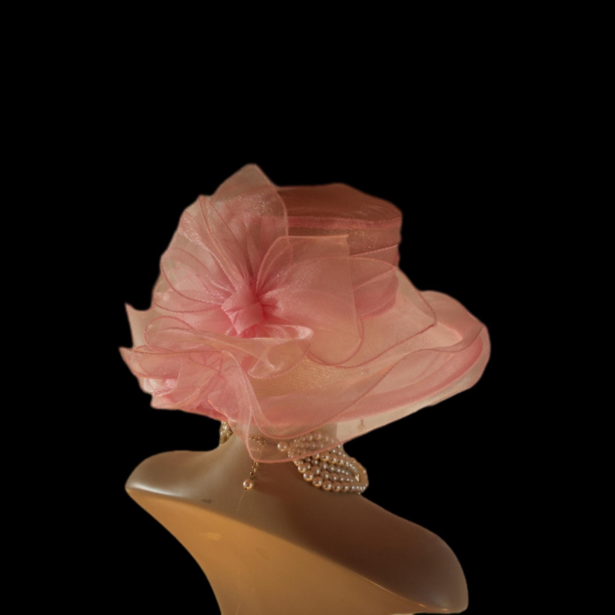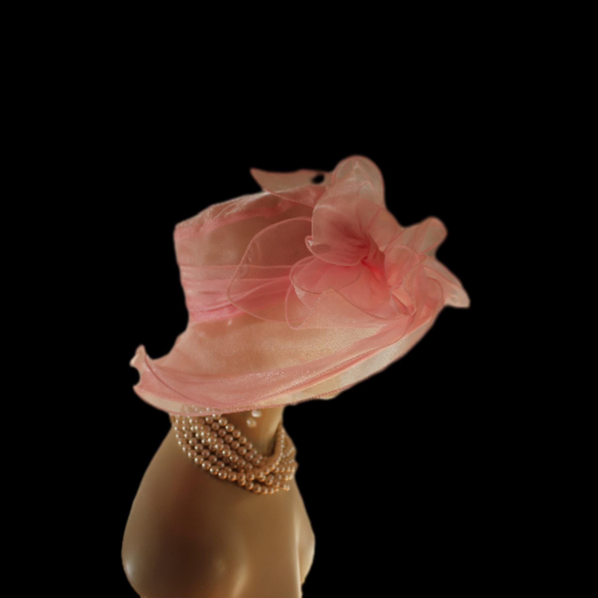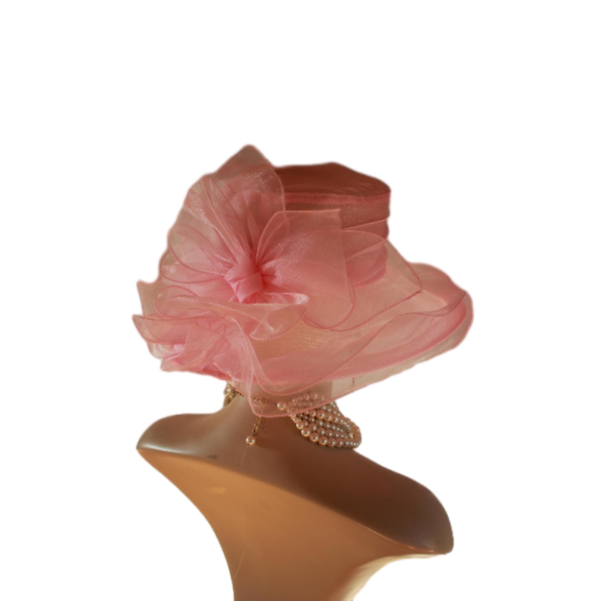Ladies Pink Sheer Soft Big Classic Designed Ruffle Brim Designer Dress Hat. This Old Hollywood Vintage Inspired Fashion Hat Is Embellished With A Large Organza Fabric Decorative Bow, Enhanced With Large Organza Handmade Millinery Flower Petals. Delicate Pink Coque Feathers Are Placed Within The Beautiful Bow For A Feminine Romantic Look. A Sheer Organza Band Is Placed Around The Crown For A Simple Elegant Appearance.