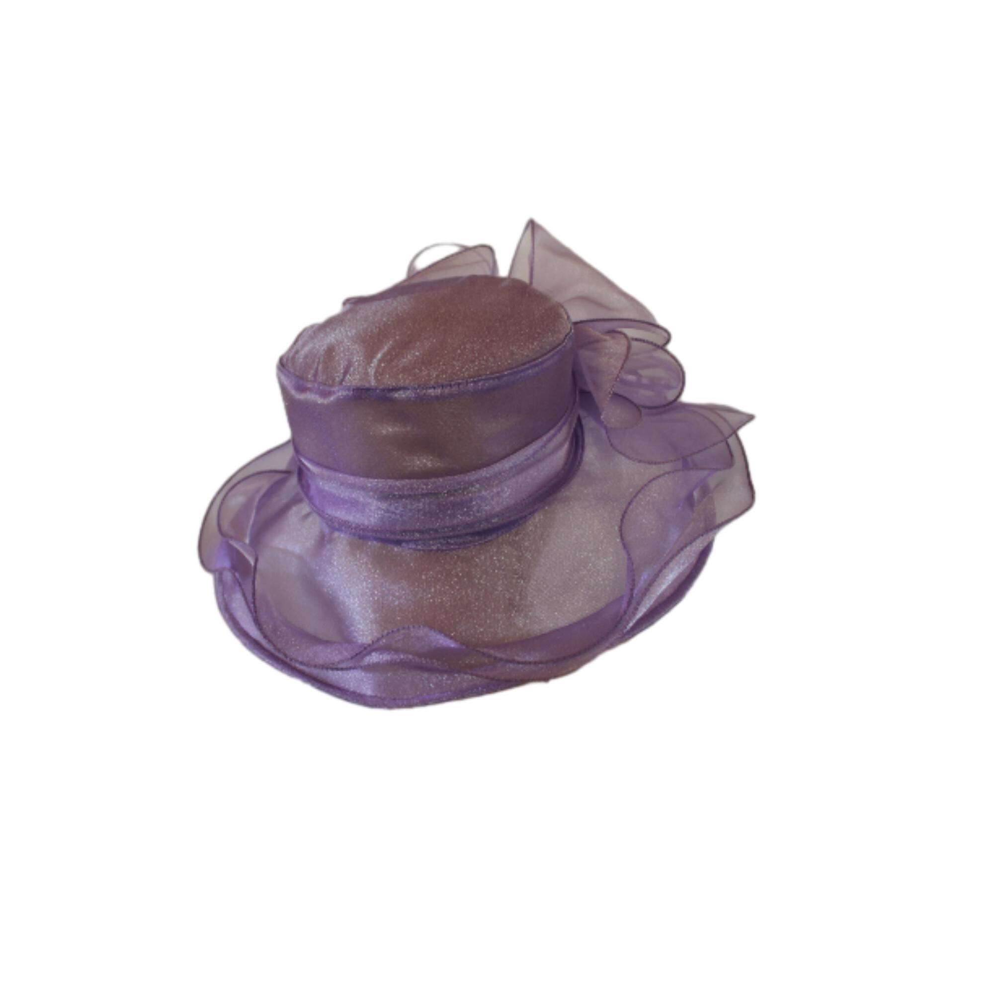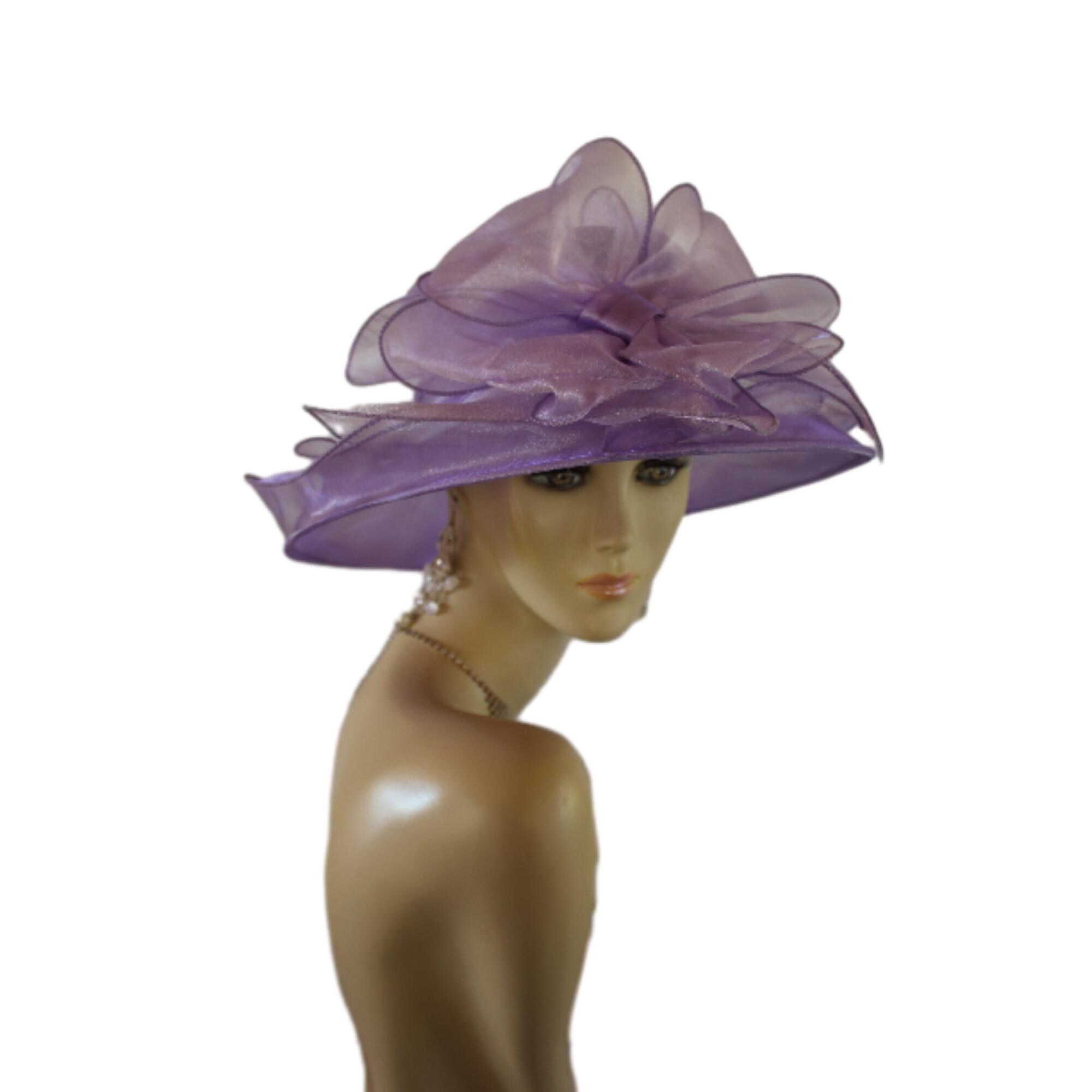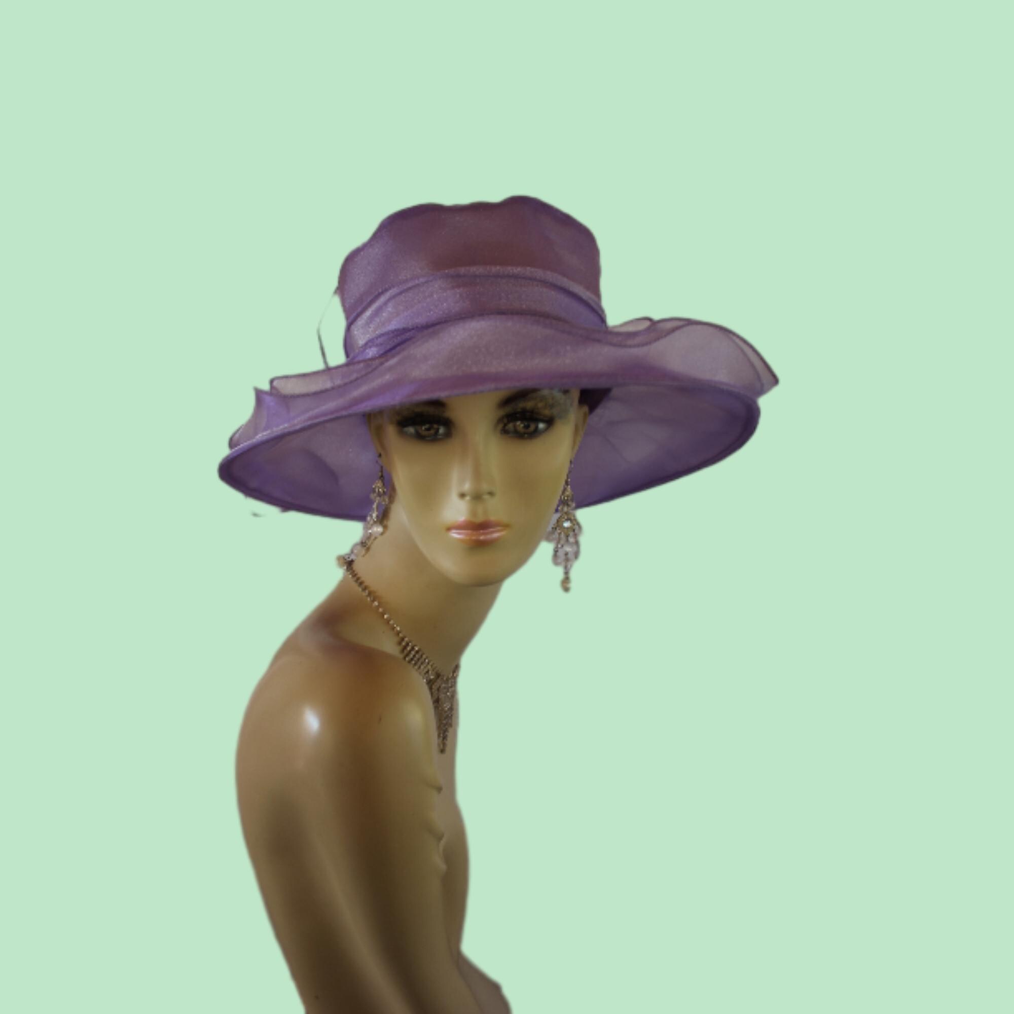 Ladies Lavender Purple Sheer Soft Big Classic Designed Ruffle Brim Designer Dress Hat. This Old Hollywood Vintage Inspired Fashion Hat Is Embellished With A Large Organza Fabric Decorative Bow, Enhanced With Large Organza Handmade Millinery Flower Petals. Delicate Pink Coque Feathers Are Placed Within The Beautiful Bow For A Feminine Romantic Look. A Sheer Organza Band Is Placed Around The Crown For A Simple Elegant Appearance.